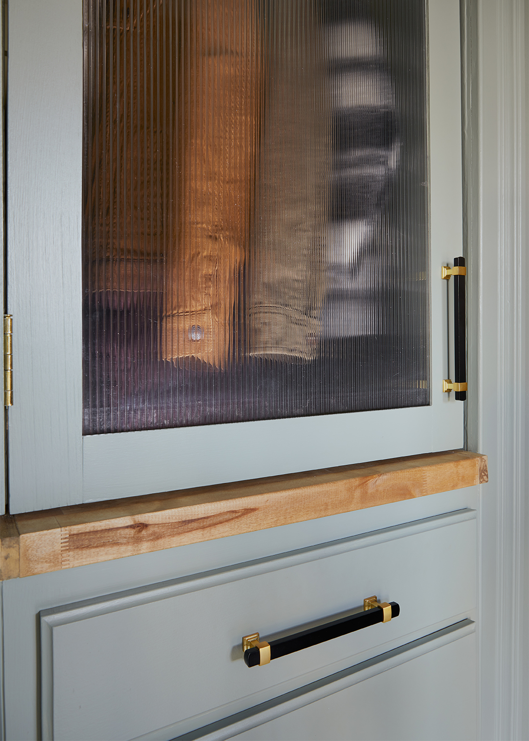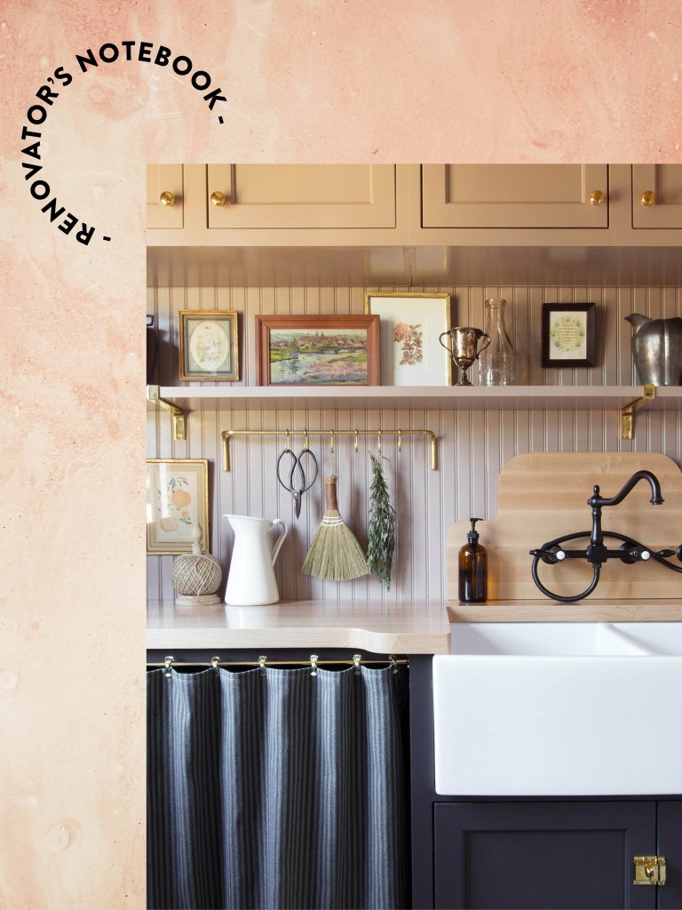 Rashida let us in on a secret: The vintage-looking closet door isn’t glass. “It’s actually corrugated plastic roofing that we cut down to size,” she reveals. Originally meant for greenhouse construction, the material evokes ribbed glass for a fraction of the cost—at Home Depot, a sheet will run you about $20. By picking up the material from her local hardware store, she also avoided any lengthy lead times. A coat of Benjamin Moore’s Heather Gray paint on everything from the walls to the drawers completes the custom look.