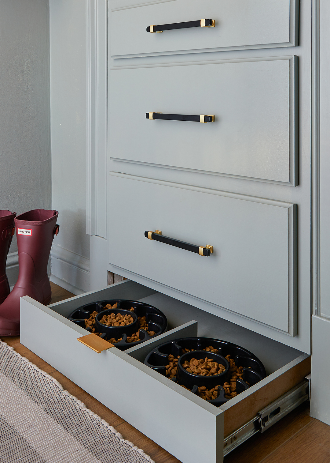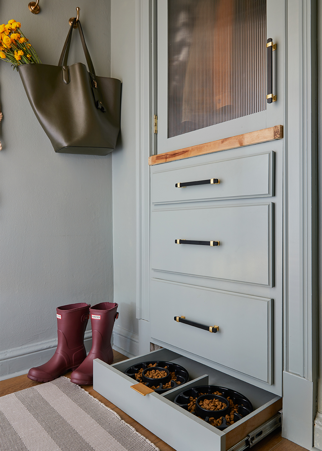 Now the baseboard drawer hides two dog bowls, and the larger one above holds containers of food and treats. Despite the additions, the Bankses didn’t lose an inch of storage. “Everything went back into the closet that was already there, but now it’s actually a functional place,” says Rashida. “We have a junk drawer now!”