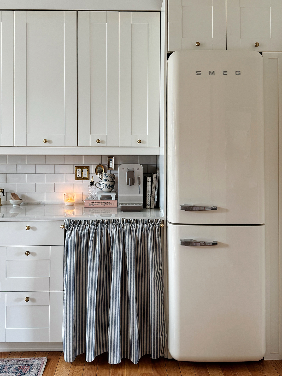 While the rod looks dainty, “the magnet is strong,” Fletchall says. “As long as you place it directly above the dishwasher handle, you can grab both when opening and closing the dishwasher.” The project is proof that working smarter, not harder, pays off: “I love that the curtain style can change up the look easily depending on if you want something more English Cottage or perhaps something more minimal to fit with a modern kitchen,” she shares. Now, a miniature landscape and an Art Deco-style antique mirror complete the kitchen’s dreamy coffee corner—zero time-worn appliances in sight.