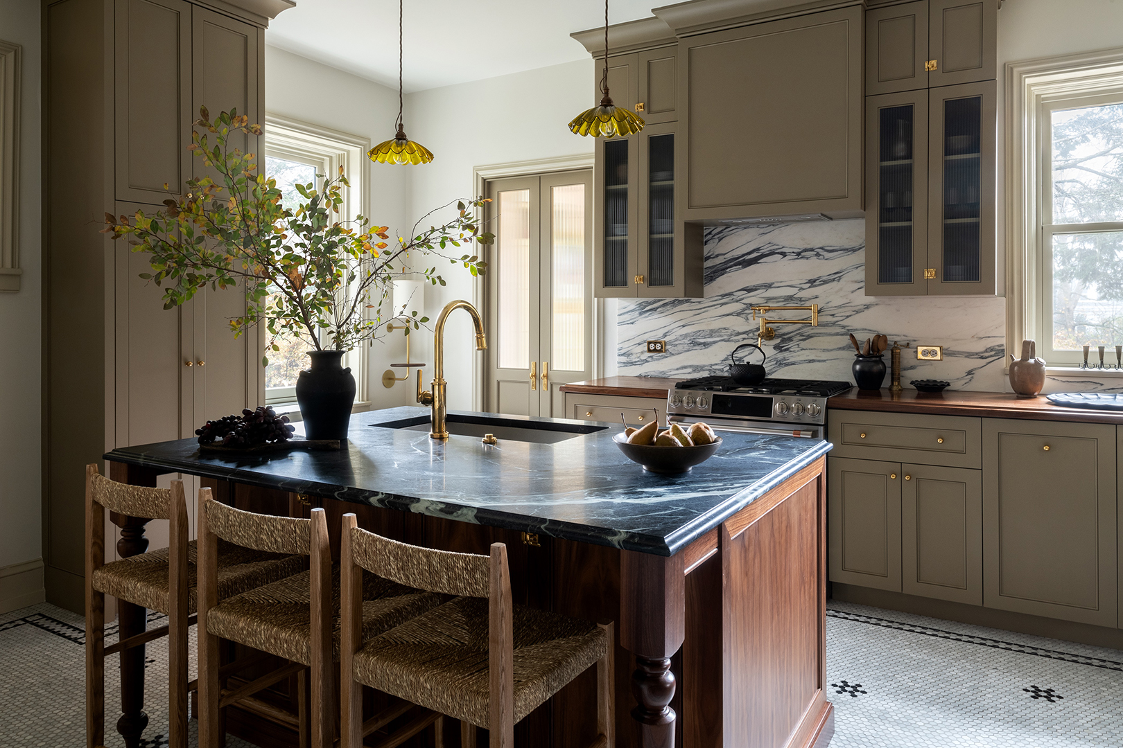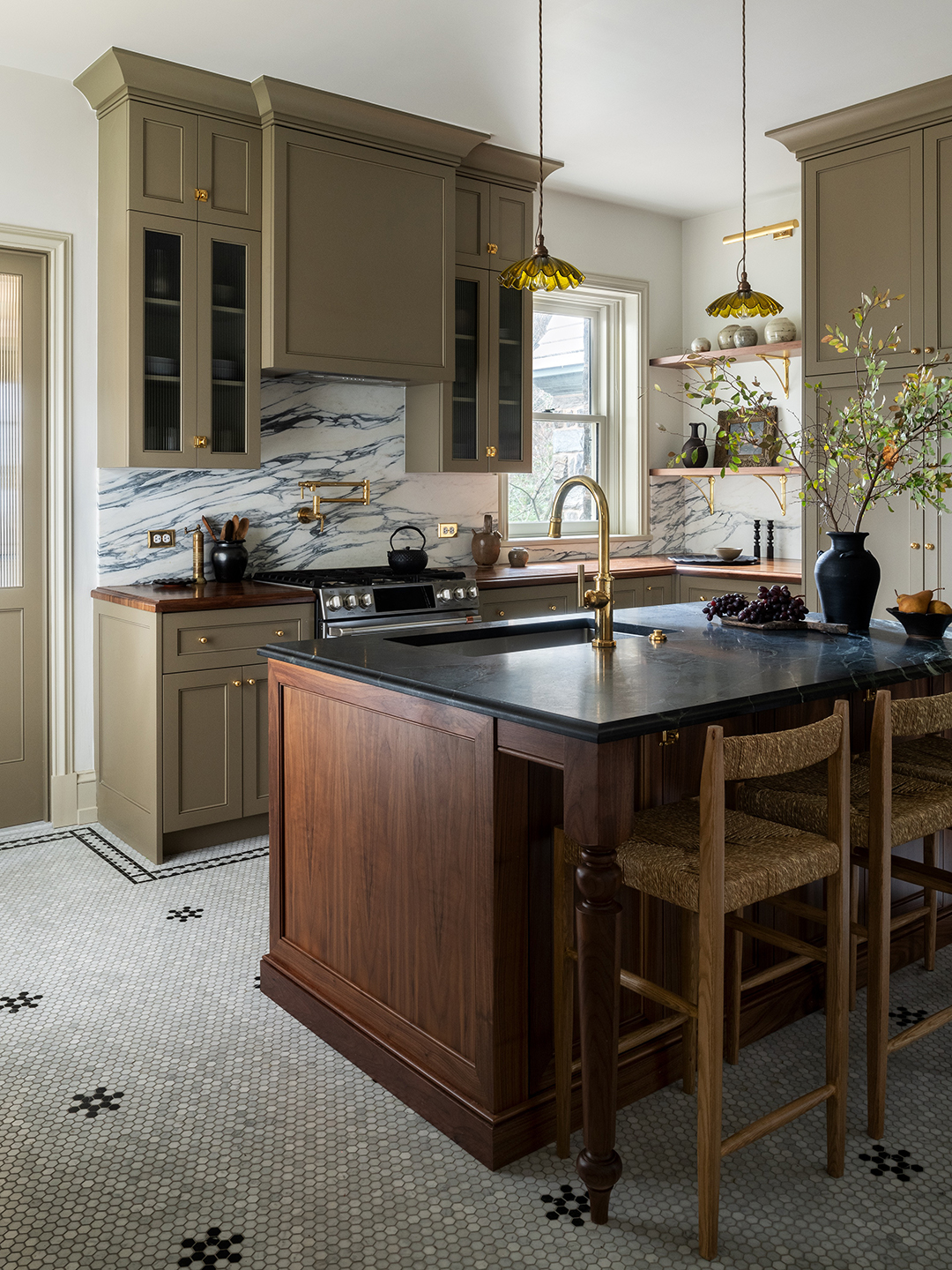 To add some charm, Em leaned into the room’s surroundings—both within the house and outdoors. The earthy color palette—Benjamin Moore’s Silver Satin for the walls and ceiling, Balboa Mist for the trim, and Smokey Ash for the cabinets—reflects the home’s leafy neighborhood. Installing a soapstone-topped kitchen island was a big step in addressing the functionality issues. “We wanted the space to flow with the rest of the house, but still have modern conveniences,” she notes. Here’s how she made it happen.