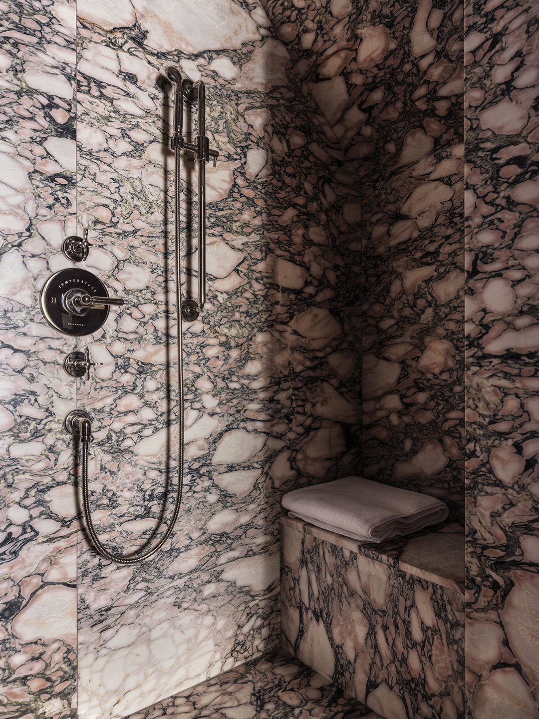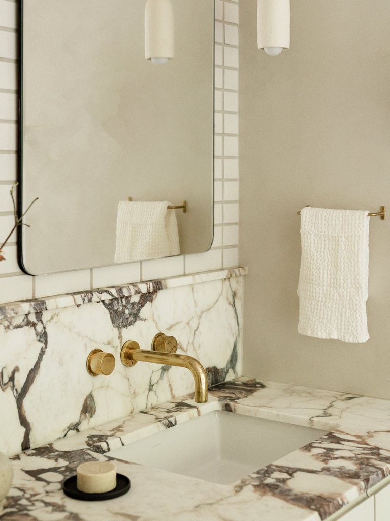 Previously, when Jonny and Krystal entered their bathroom, they’d find two small freestanding sinks to the right and left of the door and a tub-shower tucked in the corner. To achieve a more comfortable bathing experience, Post Company shifted the shower placement to the center of the room where the ceiling height is the tallest. Then they clad the whole thing in dramatic slabs of Calacatta Rosa marble, mimicking the same level of saturation in the mudroom downstairs.