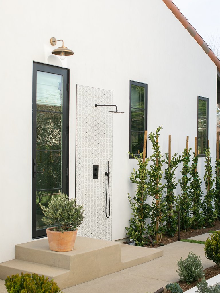 The central shower placement also lets whoever is in there enjoy the views out of the bedroom window. “When you’re in a more private space, you don’t necessarily have to close your bathroom door,” Salem points out. Going with two small doors over one large swing one allows for some flexibility without totally blocking the path to the bed.