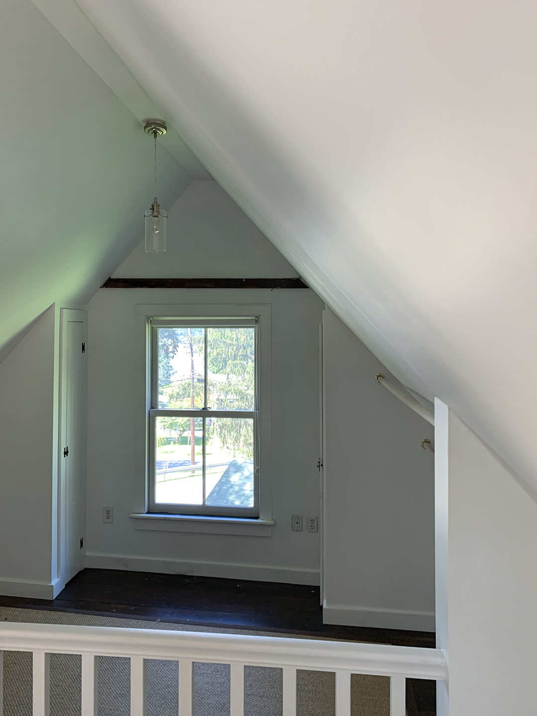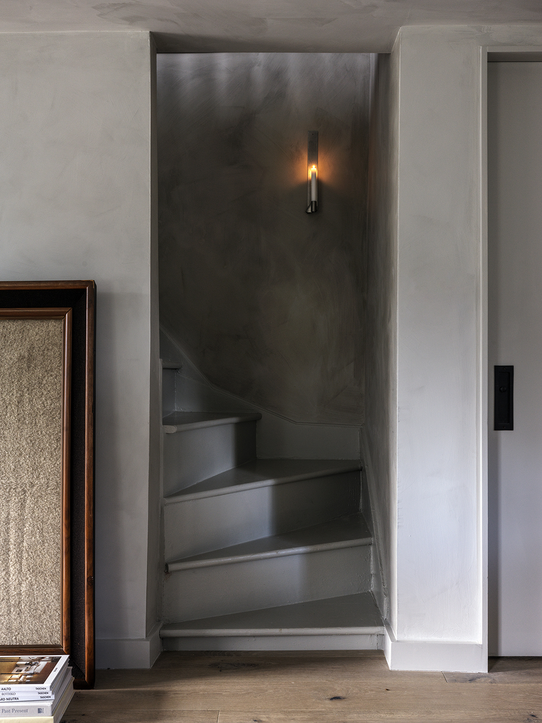 Post Company urged them to stick with the rusty red color (Benjamin Moore’s Tawny Rose), at least until they saw it in person. They agreed and eventually found the photos really didn’t do it justice. “Now it’s everyone’s favorite room because it provides a wonderful contrast,” adds Jonny. As you reach the end of the 4-foot-long hallway, you are introduced to the kitchen, swathed in Soapstone by Portola Paints. When you round the corner up the narrow staircase to the main bedroom, you’re greeted by a moody gray surprise.