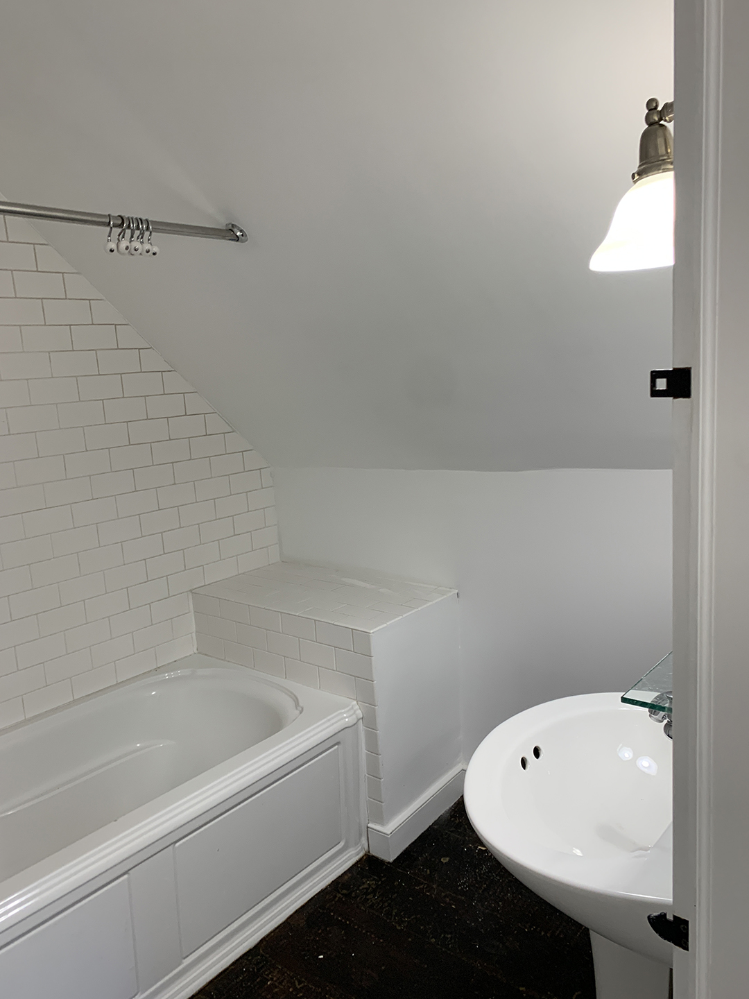 Not pictured? The bathroom’s moody lighting. There are two matching sconces over the new vanities on either side of the door, as well as a canned bulb that throws light down the center of the shower.