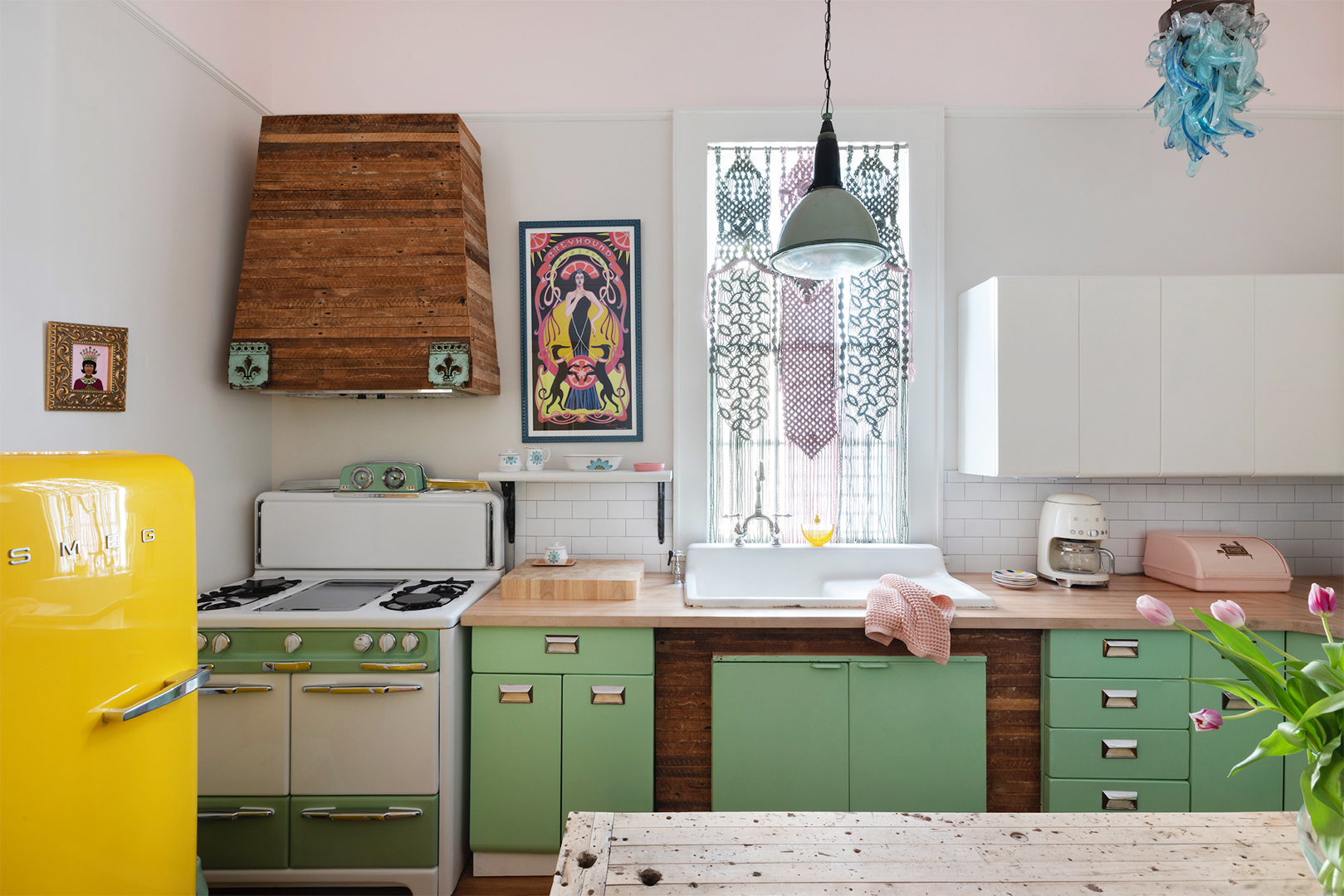 Through Facebook Marketplace, Braunschweig came across a seller in San Clemente, California, who had lovingly restored an entire set of green and white Sears Roebuck & Co. cabinets from a 1940s home and was letting them go for a mere $3,000. Don’t be fooled by their utilitarian look; according to Braunschweig, the metal doors and drawers swing and glide without a squeak. “They’re built to last,” she says.
