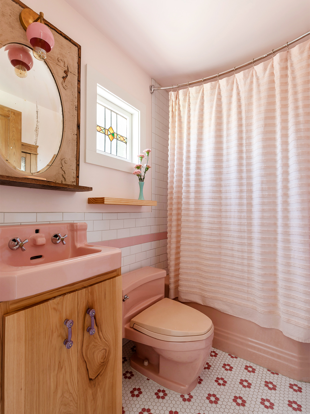 In the process of mapping out their driving route from New Orleans to Southern California (where Braunschweig’s parents live) in 2021, Braunschweig and Ramachandran identified a listing in Wichita, Texas, for two sets of antique tubs and sinks (one pink, one blue) plus a toilet. In an effort to get to them before Winter Storm Uri hit, Ramachandran drove alone to scoop up the 1947 pieces, which were sitting in a dumpster when he got there. Later on, in San Francisco, they snagged a pink toilet from the ’60s for $5 to go with the vintage assortment.