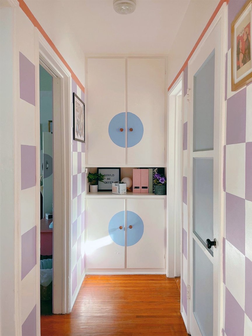 The same goes for the circles on both sets of cabinet doors at the end. Inspired by Art Deco and Miami, Soondar aimed to create a pastel and pattern-filled home. Backdrop’s Stromboli Chess Club (yes, really, she confirms with a laugh) came to the rescue to fill in the perfectly rounded edges thanks to her clever hack of tracing the outline of an old lampshade. Once dry, she swapped out the old hardware for matching wood checkered knobs (a surprising HomeGoods find!).