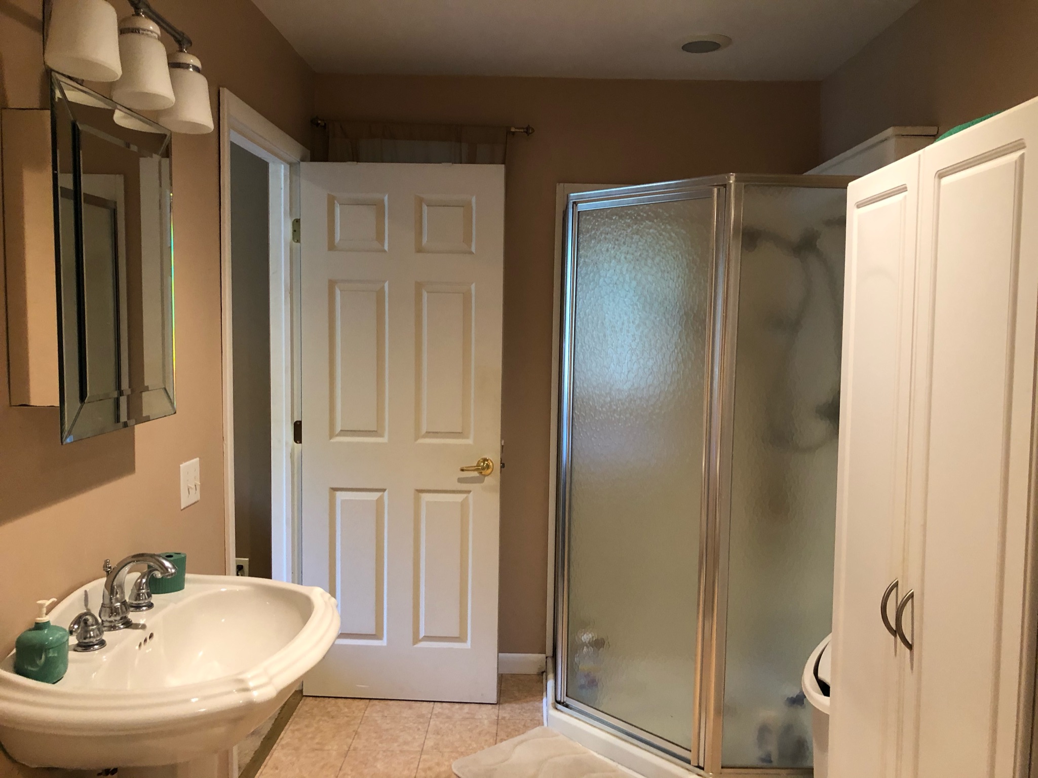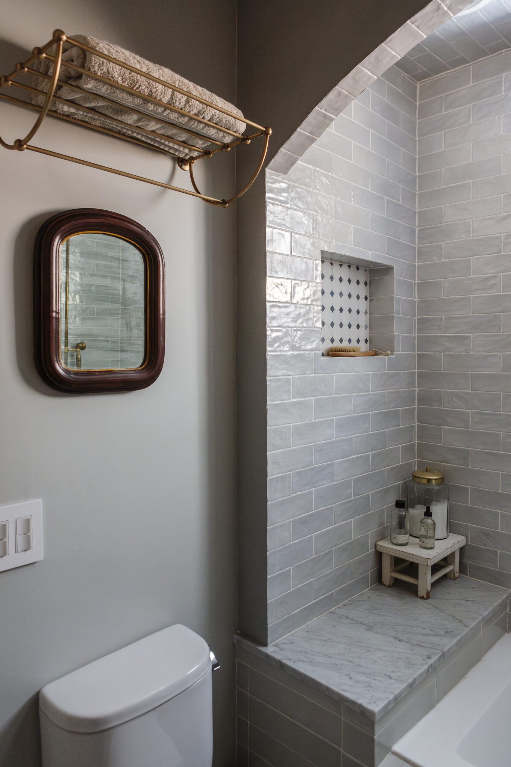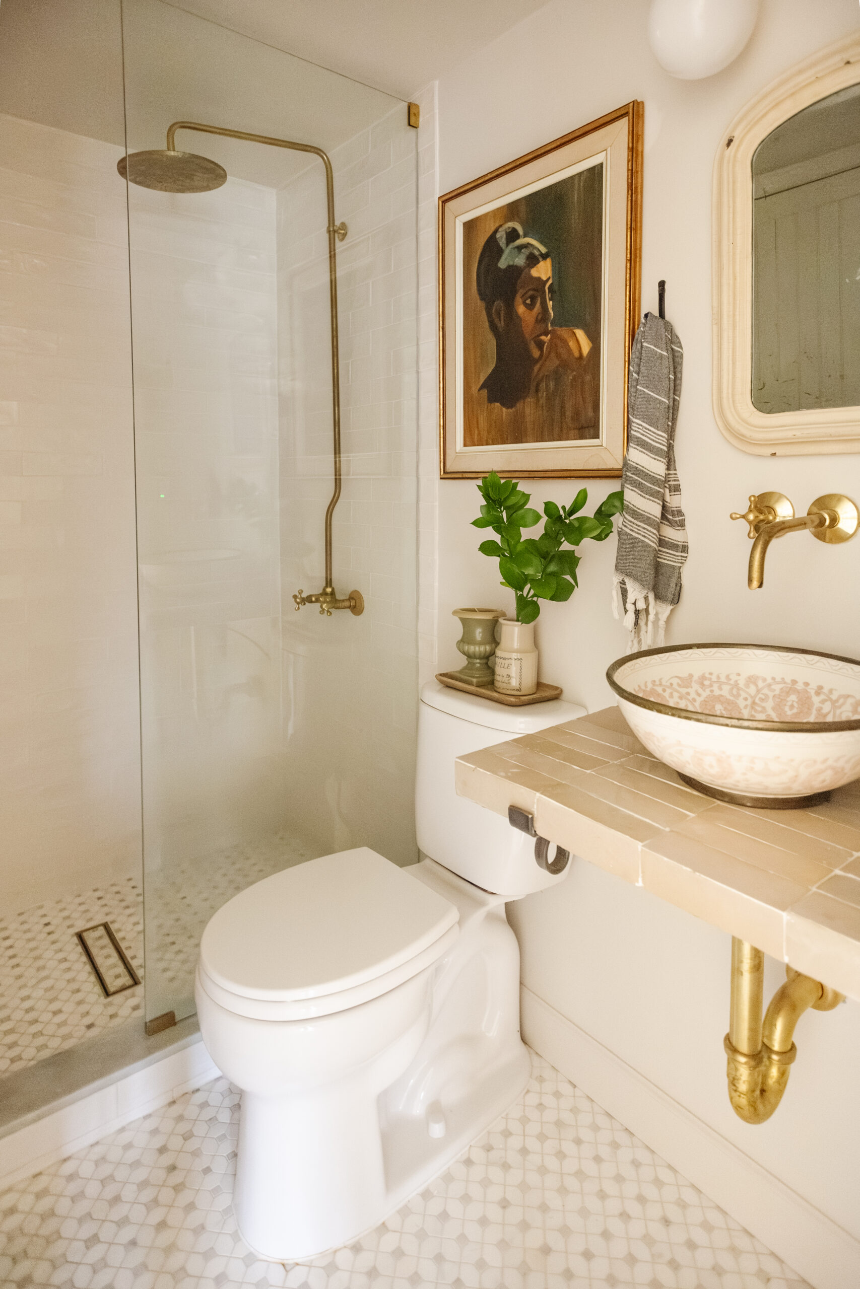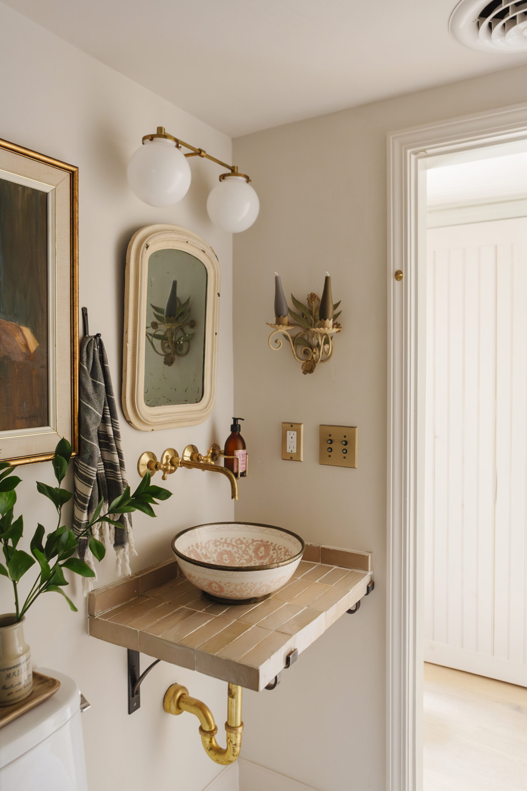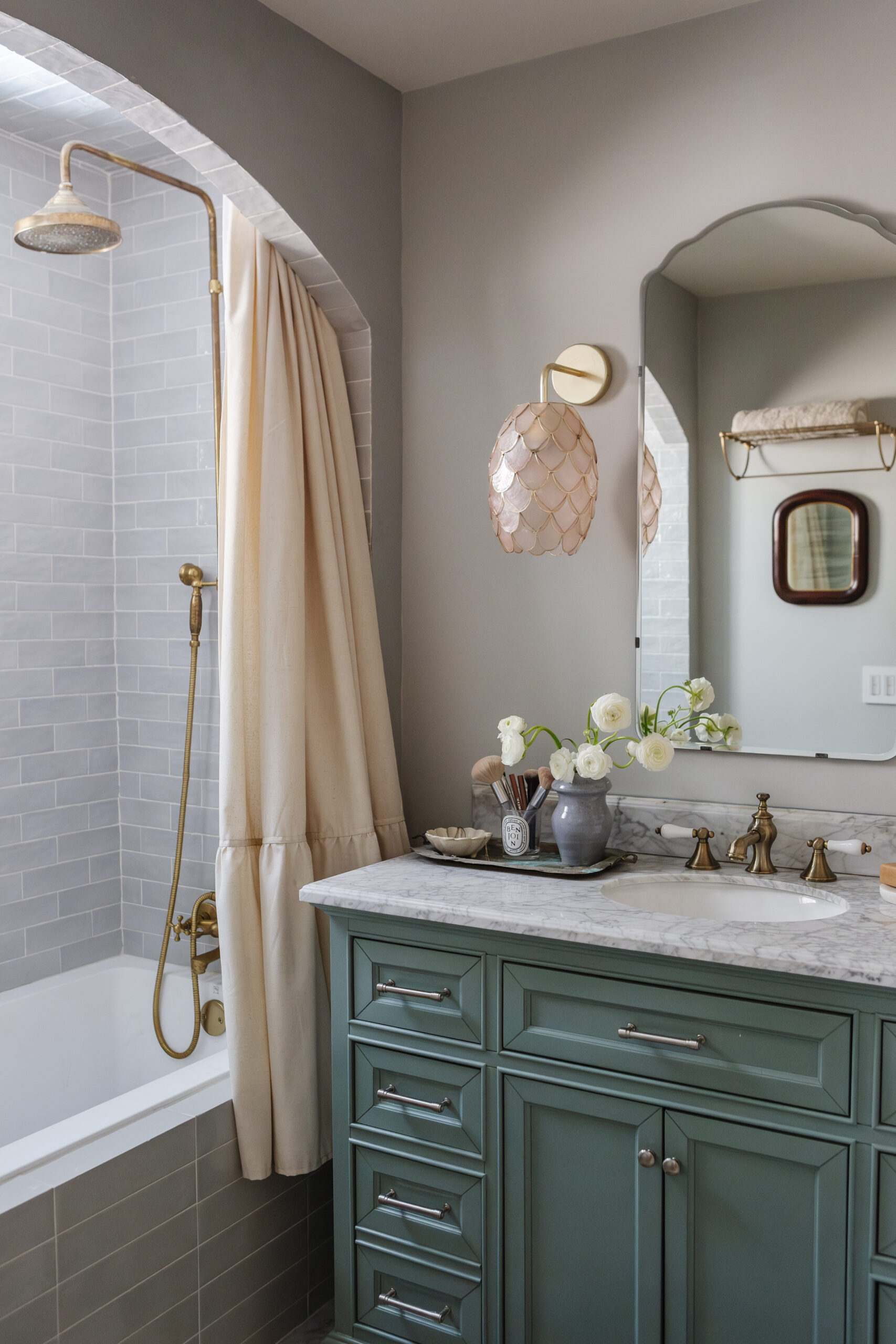 Another important layout update was splitting up the home’s only bathroom into two. The previous setup consisted of a corner shower, pedestal sink, laundry, and a lot of wasted empty space in the middle. In the process of carving out the new primary bathroom, Arden installed a 24-inch-wide vintage door. The only problem was it was a hair too short, so she had her contractor extend it by tacking on a piece of wood and covering it in a sheet of brass so it looks like a toe-kick you might see in a kitchen. The new tub-shower combo features another hack of sorts: The stone bench at the end is actually a premade marble slab from Floor & Decor that’s sold as an insert for a shower shelf. “It filled that extra width and gave me a place where I can put a glass of wine or a book,” she says.