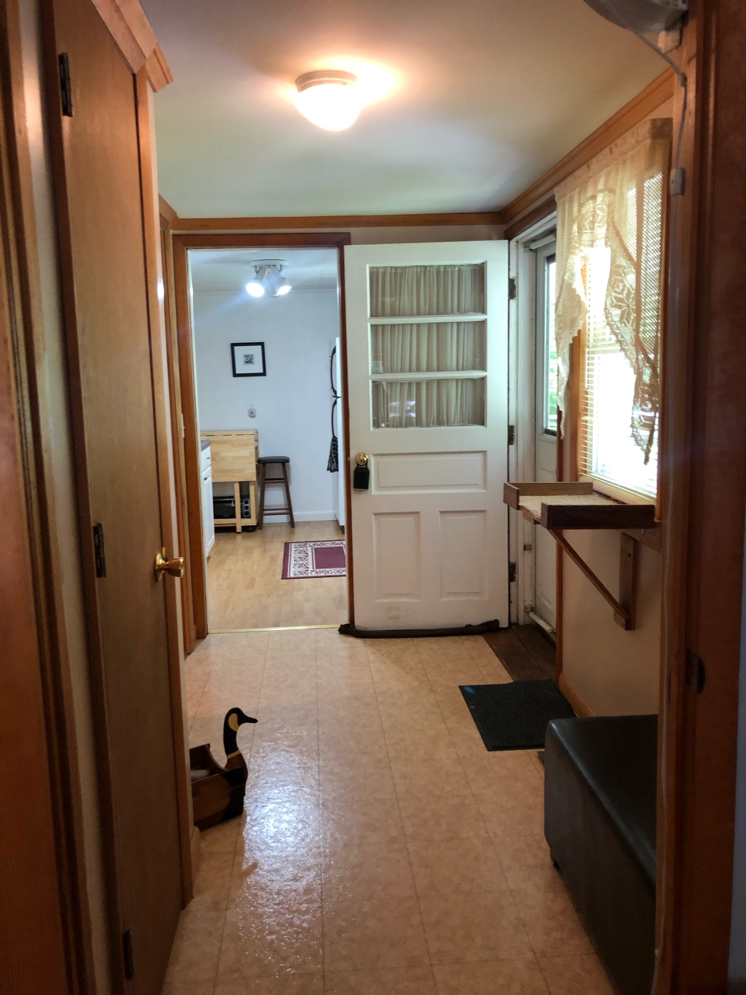“I am a big believer in rooms,” says Arden. While most homeowners would be tempted to take down the walls inside the small house to create one big open layout, Arden says that having multiple rooms makes the home actually feel bigger when you’re in it. Still, some tweaks were necessary, like moving the primary bedroom door from the foyer to the living room to create a proper entryway. “Even though there’s hardly room for anything, having a tiny table and a closet gives a better impression versus walking right into a kitchen or living room,” she says. She made the foyer feel even more special by cladding the floors in salvaged thin brick tiles, finished with a hefty layer of white grout to give it an older look.