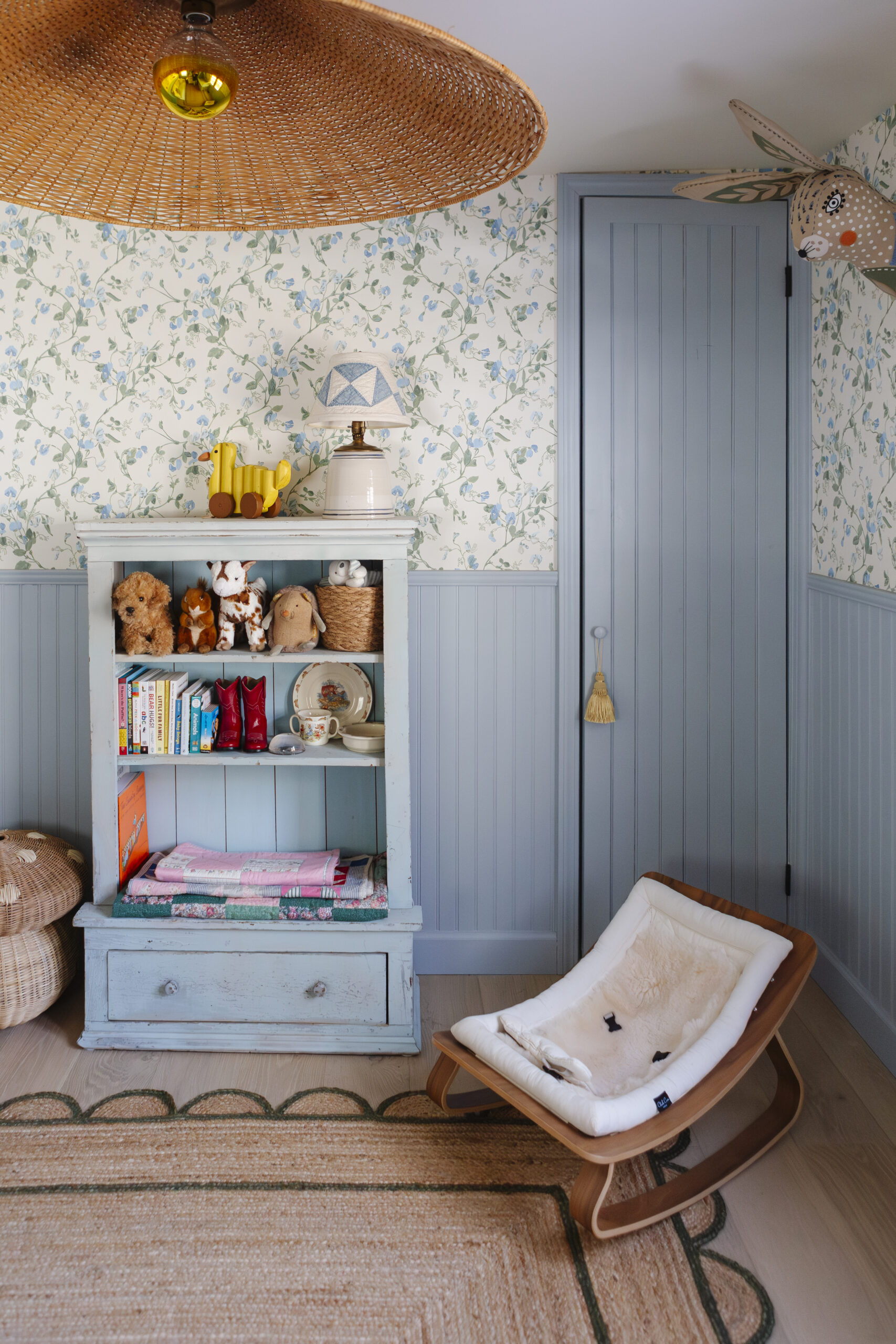 You won’t find many simple sheets of drywall in Arden’s home. Most of the walls are either covered in shiplap, beadboard, Roman Clay, or wallpaper. “I think that adds a lot of depth and warmth to the space,” she says. The floral wallpaper in the couple’s bedroom is from the John Derian x Pierre Frey collaboration; the closet door in the nursery is swathed in Farrow & Ball’s Light Blue; and even the ceiling in the kitchen is covered in beadboard.