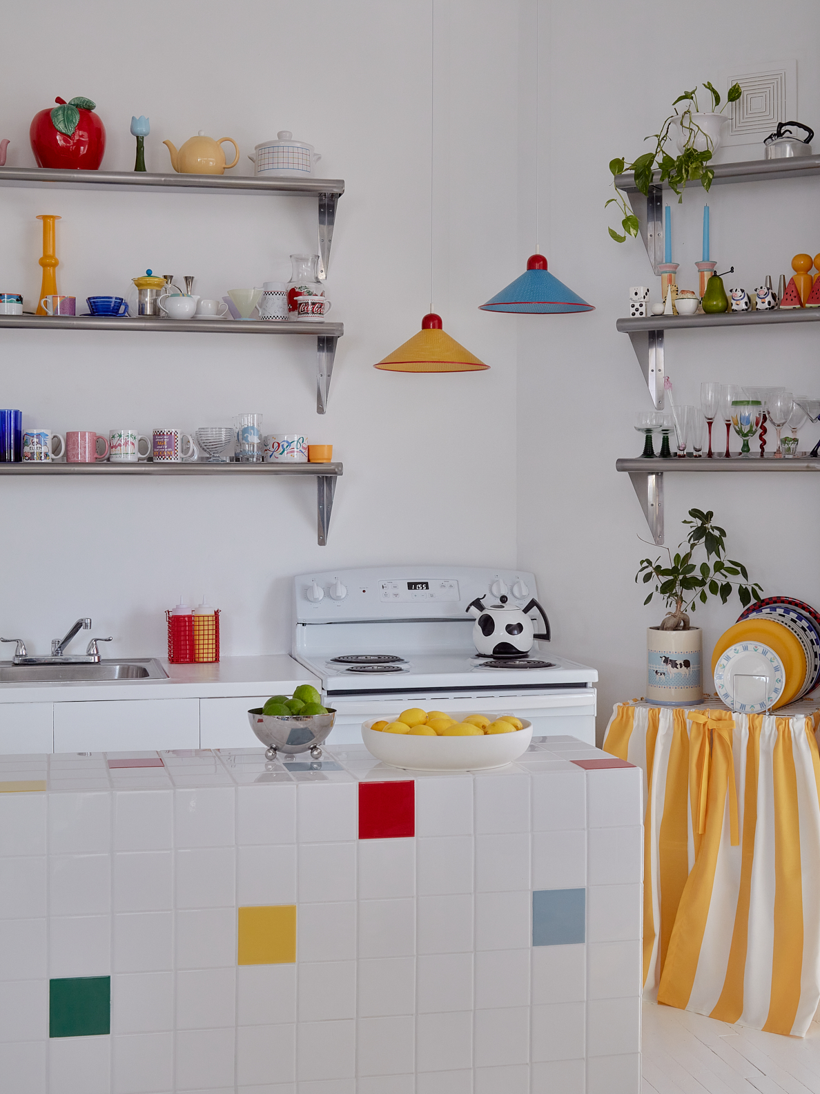 For the kitchen island, which Collé covered in Daltile’s Color Wheel Classic collection, she looked to the abstract paintings of Dutch painter Piet Mondrian. But Collé is quick to emphasize that the island is really Zoe’s domain, as the chef of the household. “The functionality is actually something that I really had to look to her for,” she says. Its interior cupboards, which are flanked by a plywood frame of custom shelves built out by Collé, hold Zoe’s collection of cookbooks, pantry goods, cutting boards, and other everyday essentials. The drawers, which are finished with 80s-inspired pulls, hold their dining and cooking utensils.