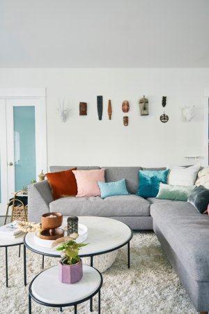 There was no need to strip the wood floorboards in Lake’s bedroom—there wasn’t any wood to begin with. “That room was actually a workout space with a rubber mat,” notes Samantha. Carpeting was the budget-friendly call in this case. The pair also reoriented the windows so they appear symmetrical from the outside looking in.