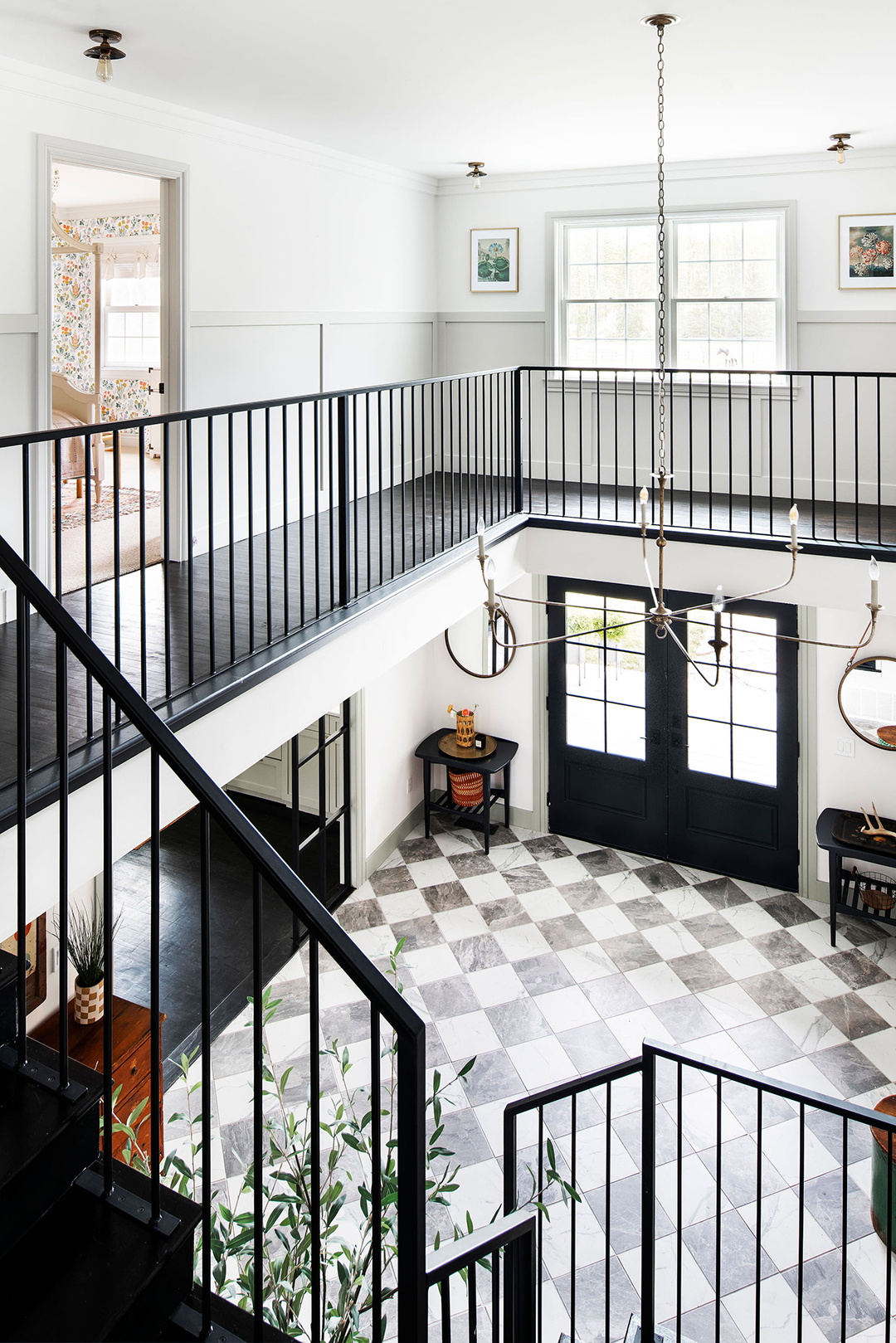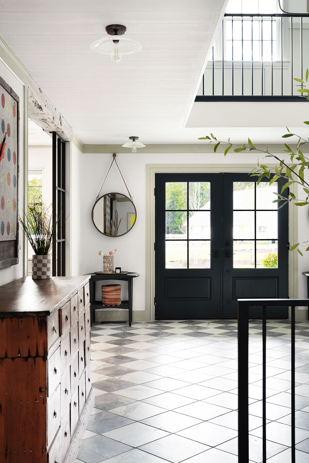 Initially, when you entered the home, you were greeted by a closed-off staircase with “very square steps” and a cherrywood banister. “It was one of the most horrendous feelings in the whole place,” Samantha says of the jarring reception. Opening up the ceiling in the foyer to expose part of the second level was a game changer, as was adding a sleek iron railing and covering the floor in a checkerboard design that looks like marble but is actually durable ceramic. “We have four very aggressive seasons in Montana, so it was important for it to be easy to clean and not too precious,” explains Samantha.