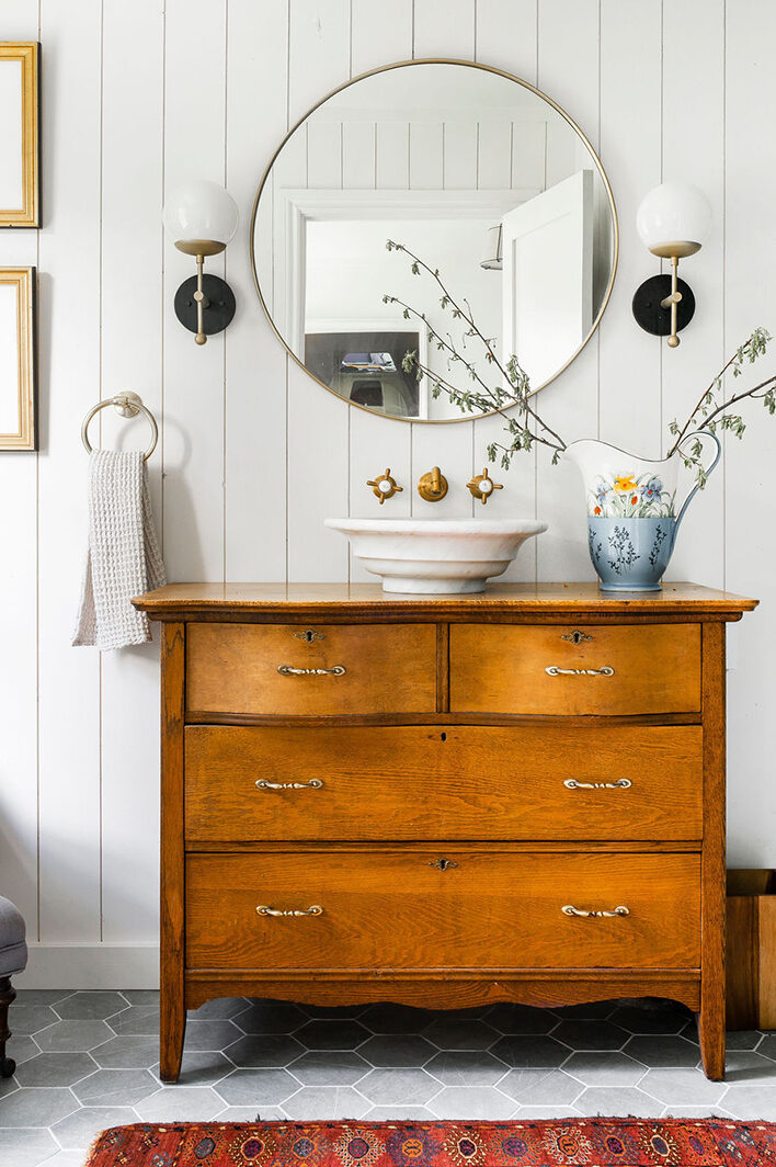 For the guest bathroom, Samantha got scrappy and spruced up an antique dresser from a local shop and plumbed it out so they could top it with a vessel sink. In their own space, they went with a curbless shower and marble floors. The prominent purple veining in the stone makes it look as if it’s all one continuous slab, so you barely notice they are actually individual tiles.