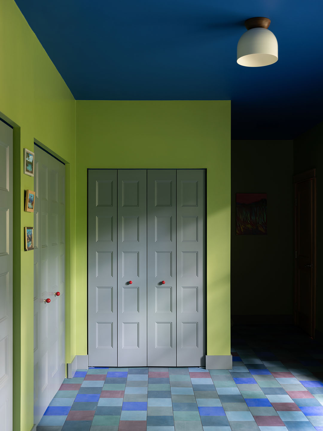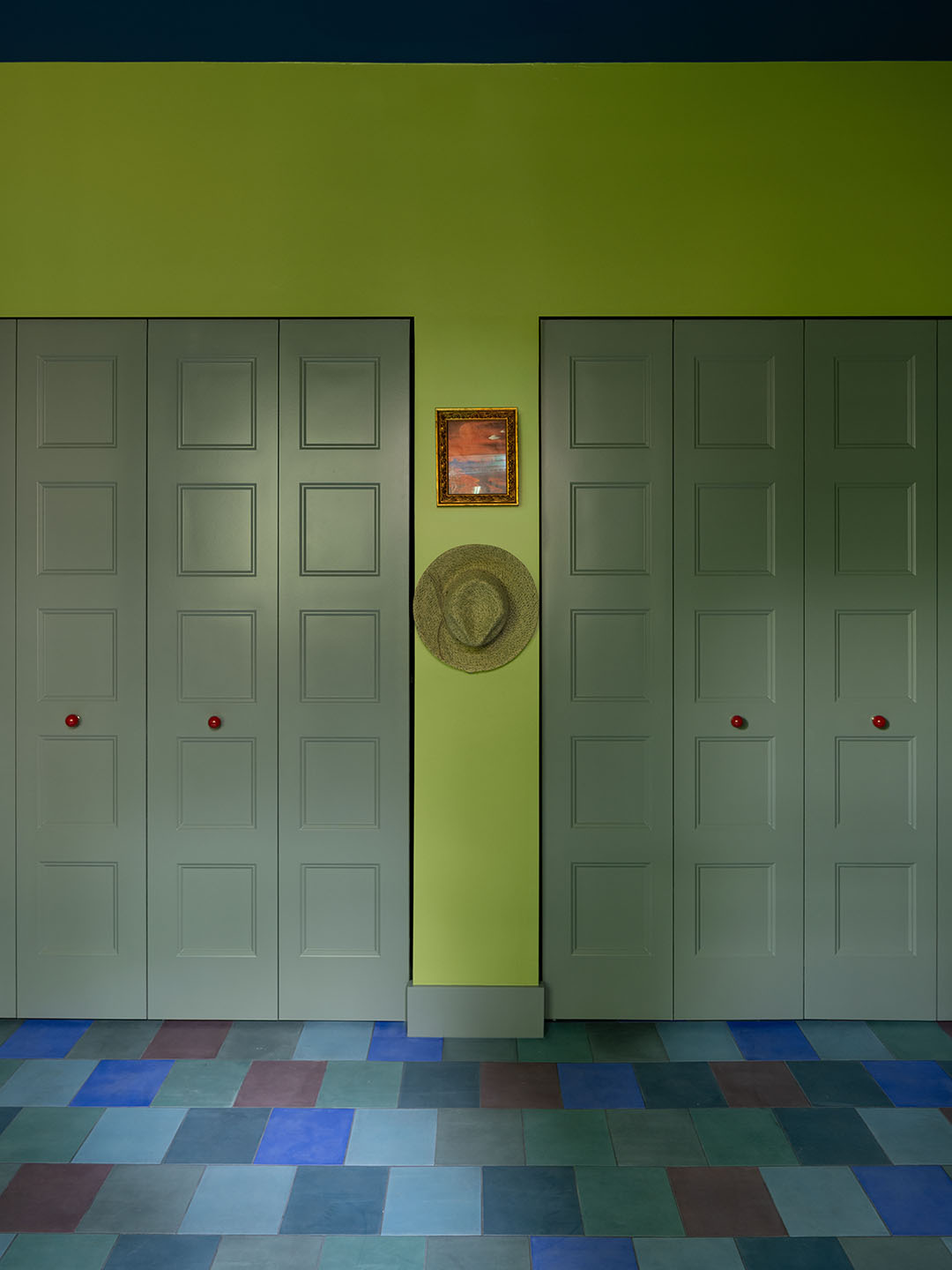 Cox and Rector brought a sense of beauty to the three bi-fold closets, which they created as a hiding spot for the owners’ abundant scuba gear. They bathed them in Clare’s Mellow Mood—a soothing sea green—and finished them with playful coral-hued Matilda Goad & Co. knobs. For good measure, they created a whimsical floor using a mix of blue and green cement tiles from Zia Tile.