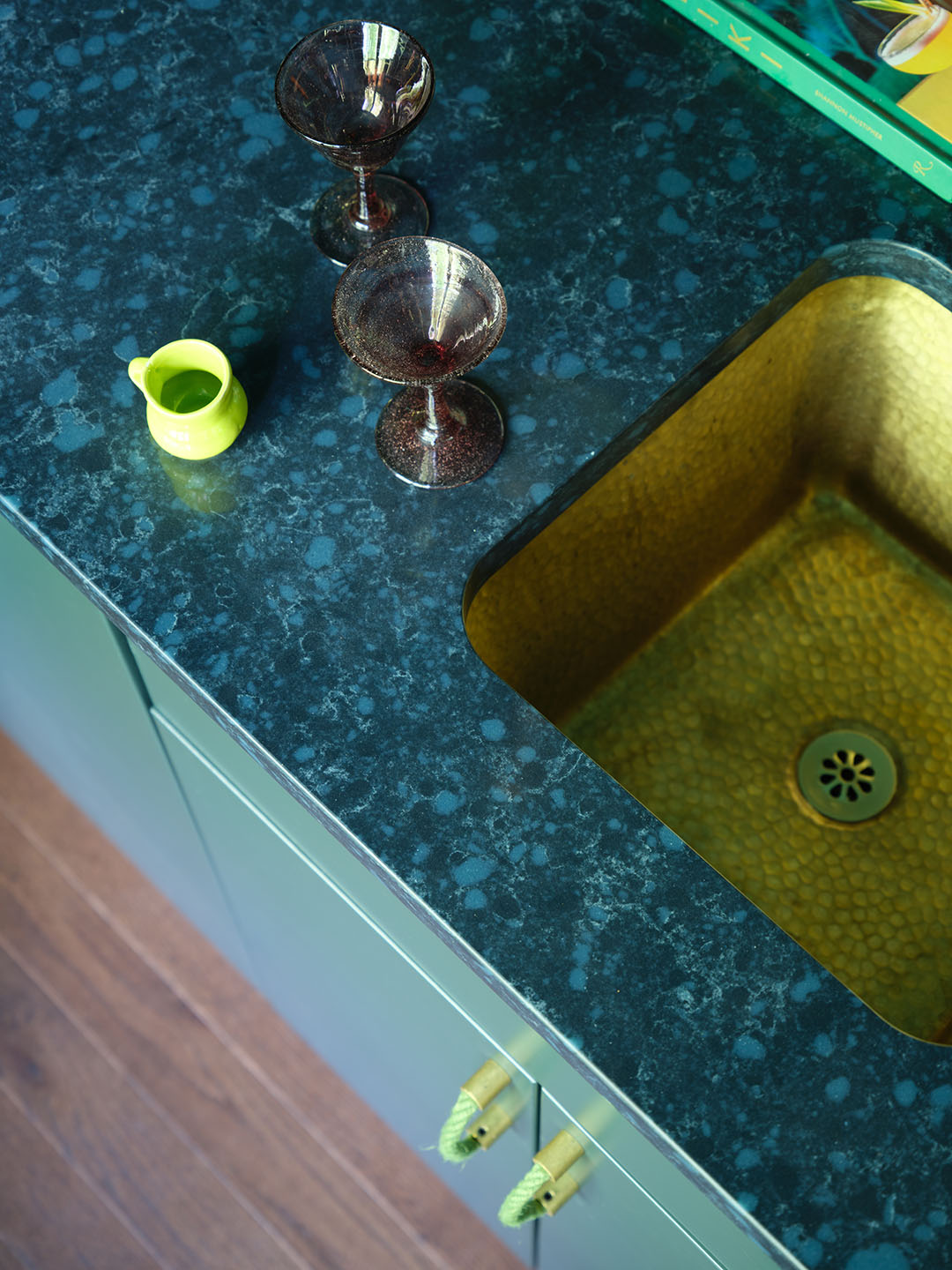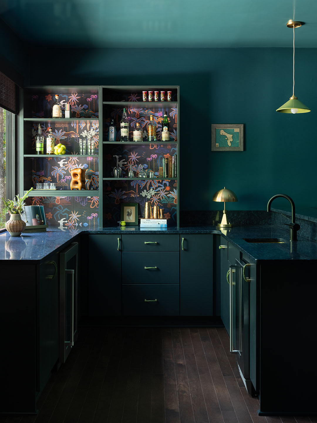 The Corian Quartz Indigo Swirl countertop in the cocktail bar is one of the first finishes the designers picked out. With soft, fluid veining, the material echoes the gentle movement of water—like a riverbed frozen in motion. To drive home the theme, they brought in a hammered brass sink that looks like a relic dredged up from the deep and neon handles that look like rope from a boat.