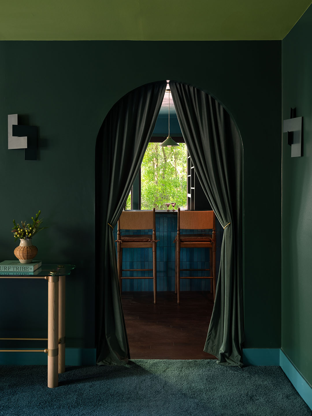 If the main house was like a breezy waterfront, this space would be the swampy deep—an immersive retreat with a quieter, moodier current. “The house sits along a river, so we leaned into a water-inspired palette,” says Cox, who, with Rector, carved out a cavernous home theater, a tide-charged lounge, a bespoke cocktail bar, and a smartly outfitted mudroom for wetsuits, fins, and everything in between. “It had to suit board games, movie nights, and craft cocktail moments with friends,” adds Rector. “It’s part fantasy, part Florida—with a Chinotto House twist.”