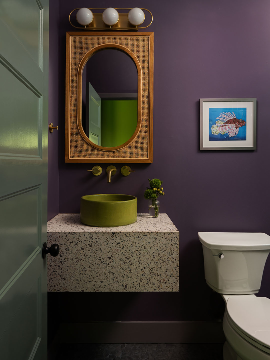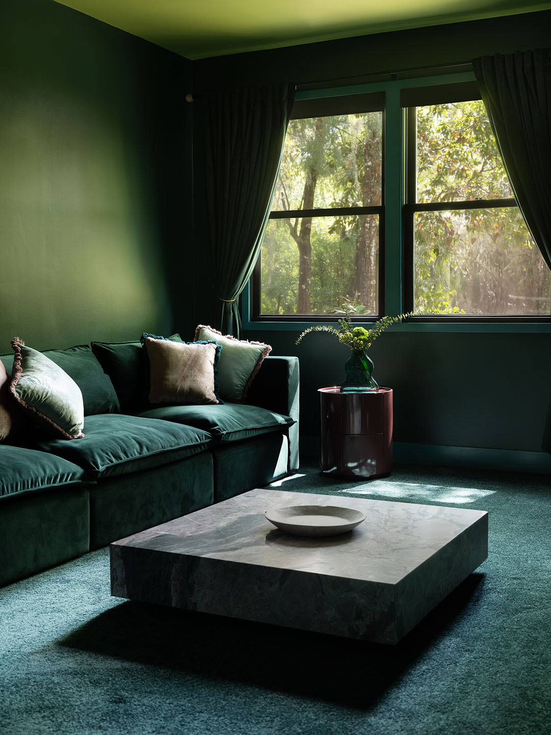 To combat all the darkness, the designers introduced playful pops of lime green—first in the form of a custom Popus Editions Giovanna sofa from Paris, and again in the bar lighting, hammered brass sink, and mudroom walls drenched in Backdrop’s Pretty Ugly. “Florida springs are full of every shade of green you can imagine, so we didn’t hold back,” says Rector. “It’s a bold color, sure, but in the right setting, that’s what makes it fun. We’re calling it now: kelp green is the It color of the summer.