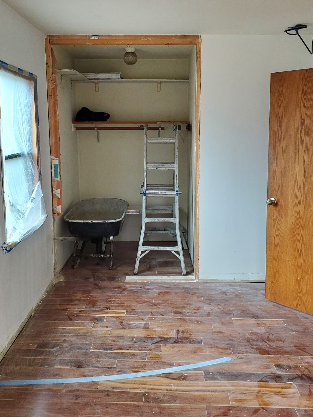 Before the couple and their son moved into their new house, Troy drew a rough line on the floor where he envisioned a curved closet wall could go. They then reached out to a local contractor, who built the wood framing for the divider, added drywall, and skim-coated the whole structure with plaster.