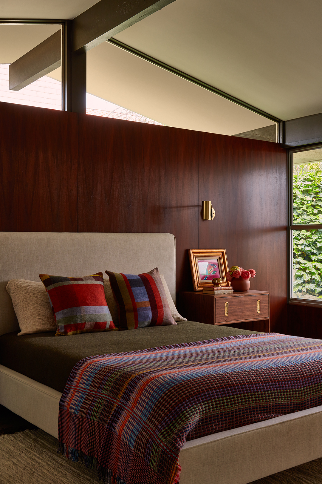 When the door is open, you can catch a clear view of the primary bedroom’s feature wall: smooth walnut paneling that ever so slightly contrasts that fluting detail. “As for the coloring in this space, we really could’ve gone either way—more earth-toned, which would’ve complemented the green tile in the bathroom, or bold. But this was our chance to have a little fun, so we took it,” she says.