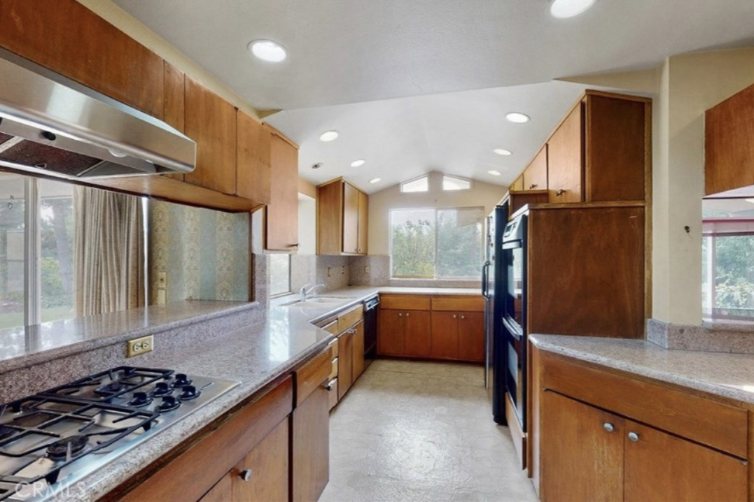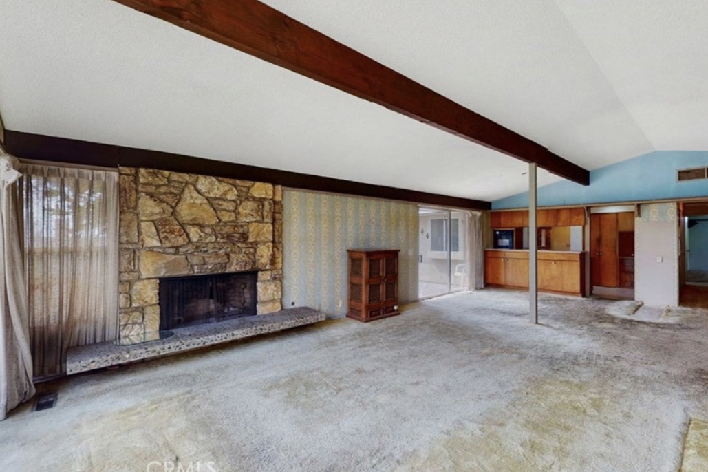 “The owners wanted to keep a lot of the original details, which I respect,” Blazek says. With their directive in mind, the designer kept the roofline intact, along with many of the windows (even the angled ones above the primary suite!). She also didn’t ditch the wood ceiling beams or the concrete beneath the shag carpeting—in fact, she eventually turned it into a main feature. And when it came time to revamp the kitchen, Blazek and the couple went against the norm.