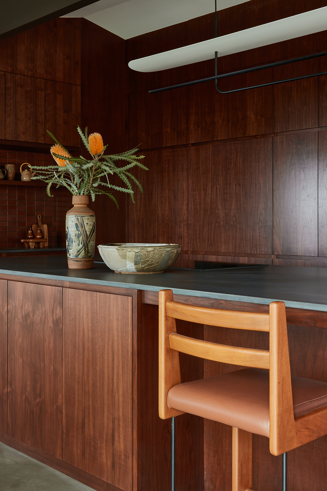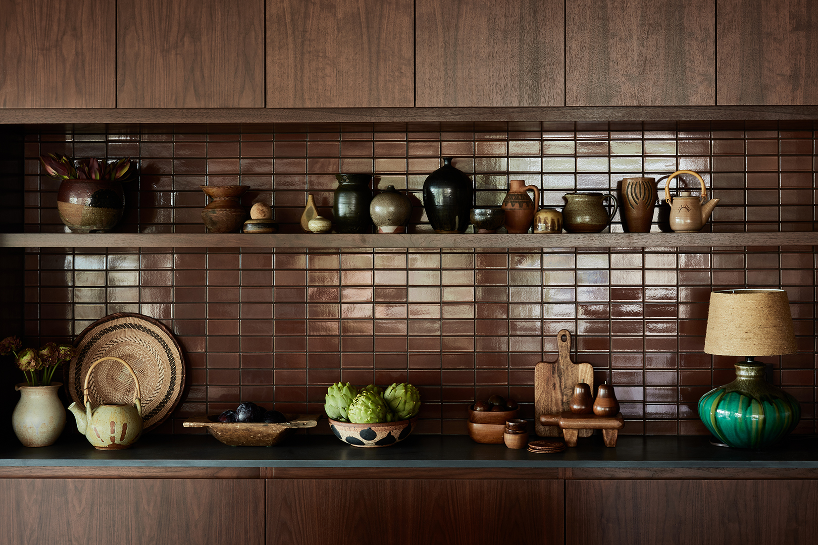 The bar seemed like the ideal place to add some texture because the majority of the walls and island are covered in flat-paneled custom cabinetry alongside black Caesarstone countertops. “I didn’t want the sheen of the tilework to stand out too much, and the monochrome brown succeeds in adding just enough movement,” says Blazek. “There’s a slight orange undertone in the tile, too, for a hint of color.” A collection of ceramics and a vintage lamp play off that backdrop with a curated subtlety, while a sleek pendant lamp above the island ensures that the kitchen doesn’t feel like a time capsule.