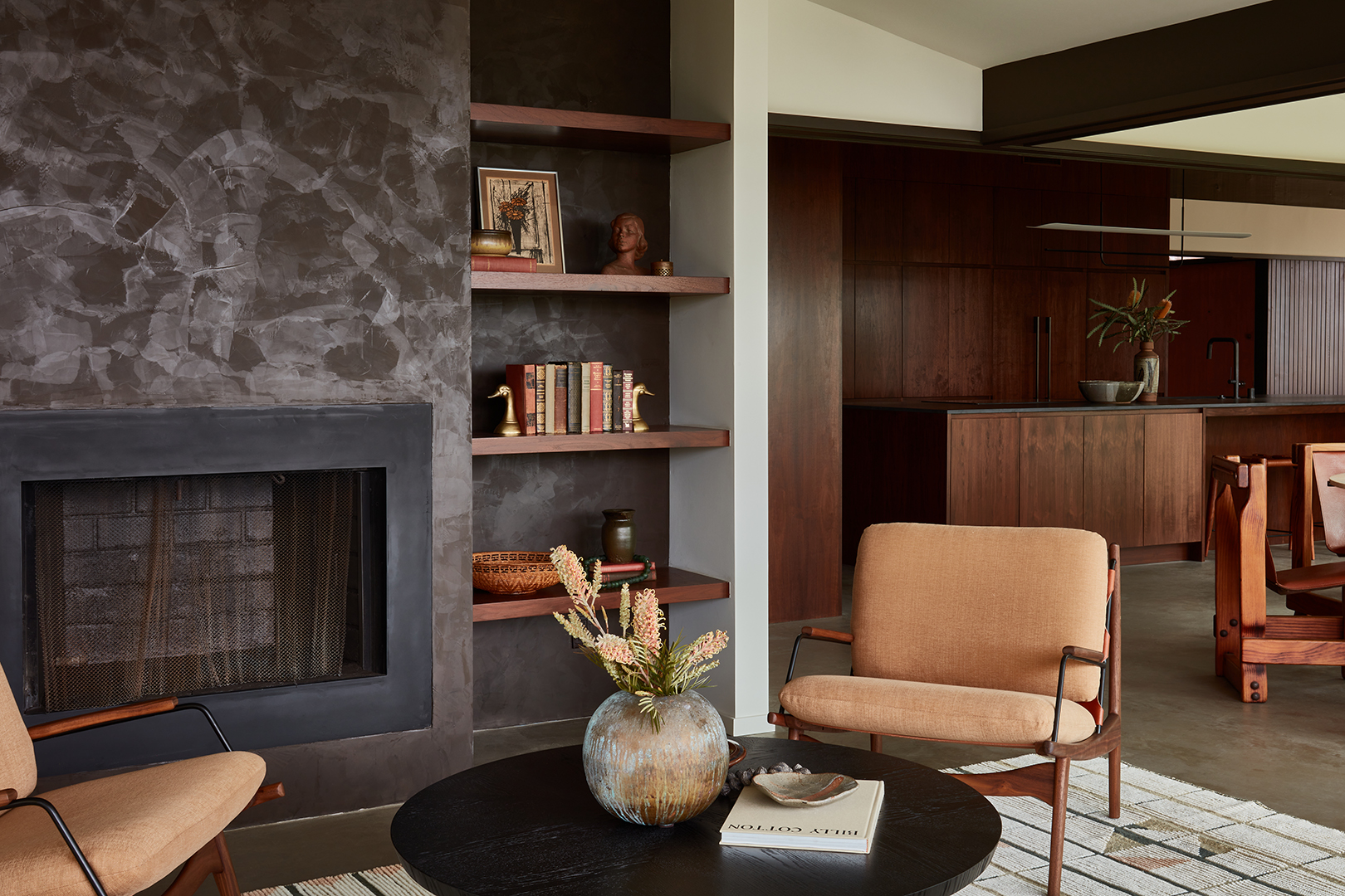 Blazek jokes that the general contractor must have run out of patience with their many nitty-gritty requests. Aside from getting the finish of the walnut throughout and the sheen of the revived concrete flooring just right, the paint had to be perfect. “There was a lot of discussion around which walls would be painted off-white and which would get a walnut detail, even down to the built-in shelving by the fireplace,” Blazek says. “I’m sure the general contractor just wanted to be done with us, but those small decisions make a big impact, especially when the architecture is so pronounced.”