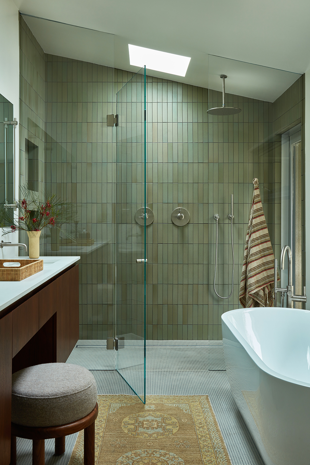 The couple’s primary suite is reached by a door on the right of the home’s main entrance via an entryway that offers more breathing room than the one it replaced. Still, though, Blazek felt the door needed something to make it feel simultaneously distinctive yet discreet. “There’s existing wood paneling in the living room, and it can be seen as soon as anyone walks in,” she says. “In order for this new entryway to feel integrated, we opted to mimic that wood detail but add the fluting to conceal the door. When the door is closed, it almost disappears into the wall.”