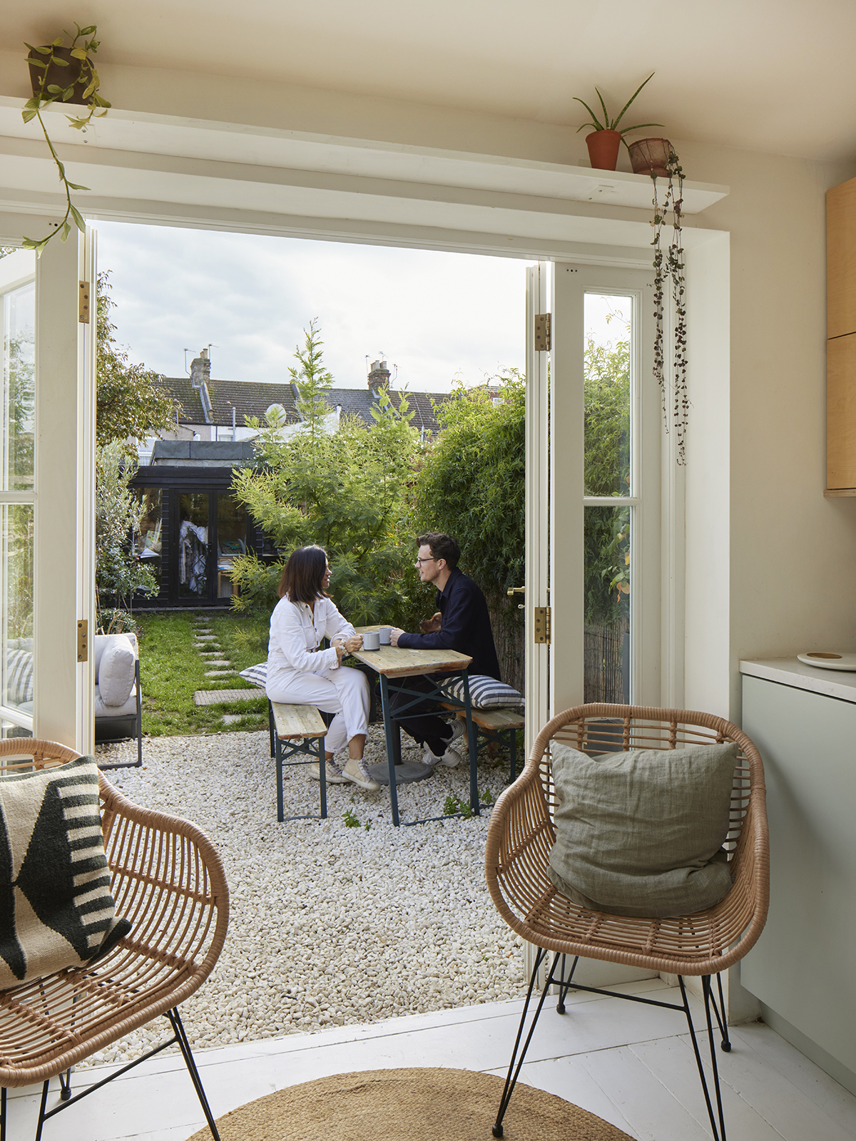 In the garden, my dad and I built a 96-square-foot studio to maximize the space we have across the whole site. It’s become a third bedroom, a home office, and playroom. Every day, I go in there with my daughter for breakfast while she plays.