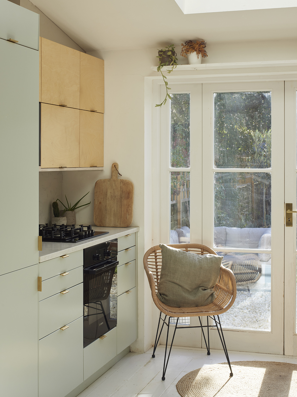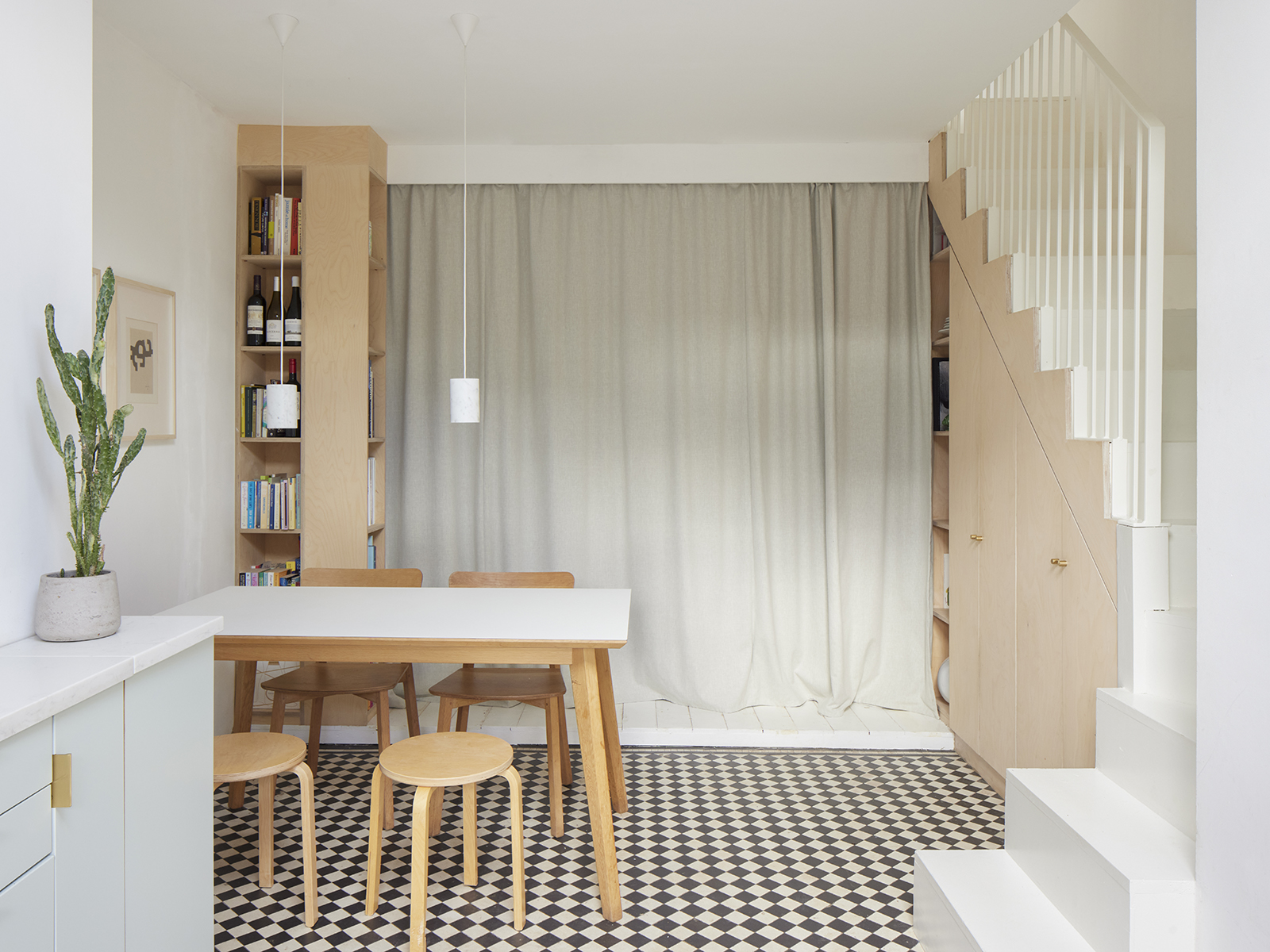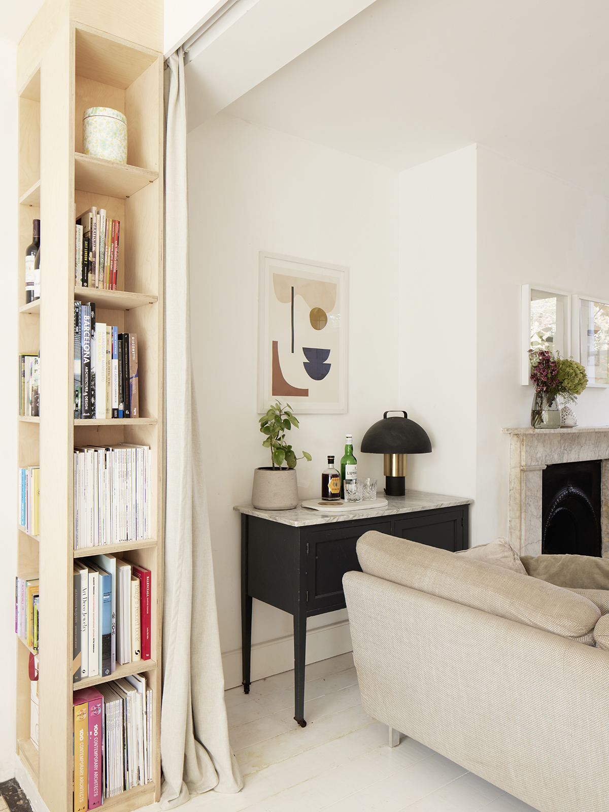 Today the first floor is completely open, filled with clever storage, a spacious-feeling living room (with a curtain to separate for overnight guests, parties, etc.), dining room, and kitchen, all leading to the backyard garden, but it took quite a lot of work to get there. We wanted a custom kitchen yet for the price of a builder-grade one. By using IKEA boxes paired with Plykea and Superfront fronts, it allowed us to have a quite high-end, bespoke space, and we managed to do it all for under £10,000 ($12,000). Even going to a low- to mid-spec kitchen supplier would have cost £20,000 ($25,000).