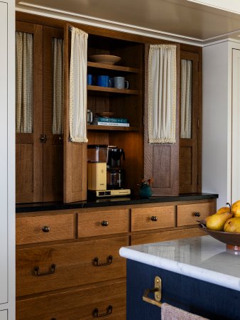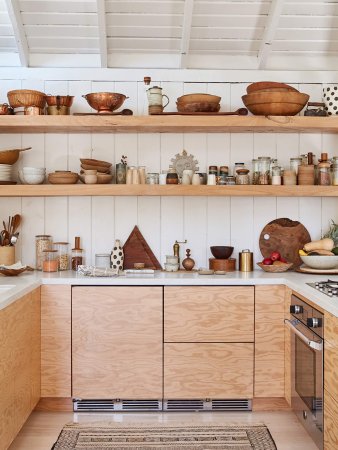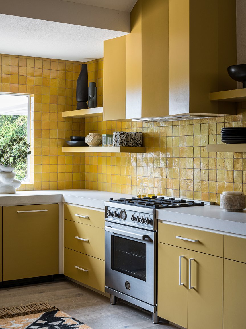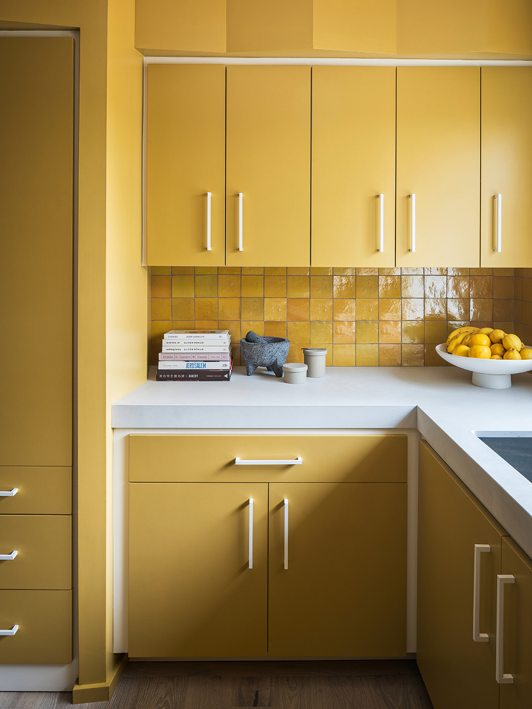 Not all yellows are made equal. “There are a million shades out there, but a lot of them are pretty terrible,” says Carrier. “We didn’t want highlighter or neon; it had to have a calming quality to it.” They decided to kick off their material selections with the backsplash first, narrowing in on Zia Tile’s zellige in the color Cadmium. The gritty texture of the 4-by-4-inch squares makes the hue feel a bit more down-to-earth. Once that box was checked off, they easily pinpointed a matching shade for the door fronts: Dylan by Portola Paints.