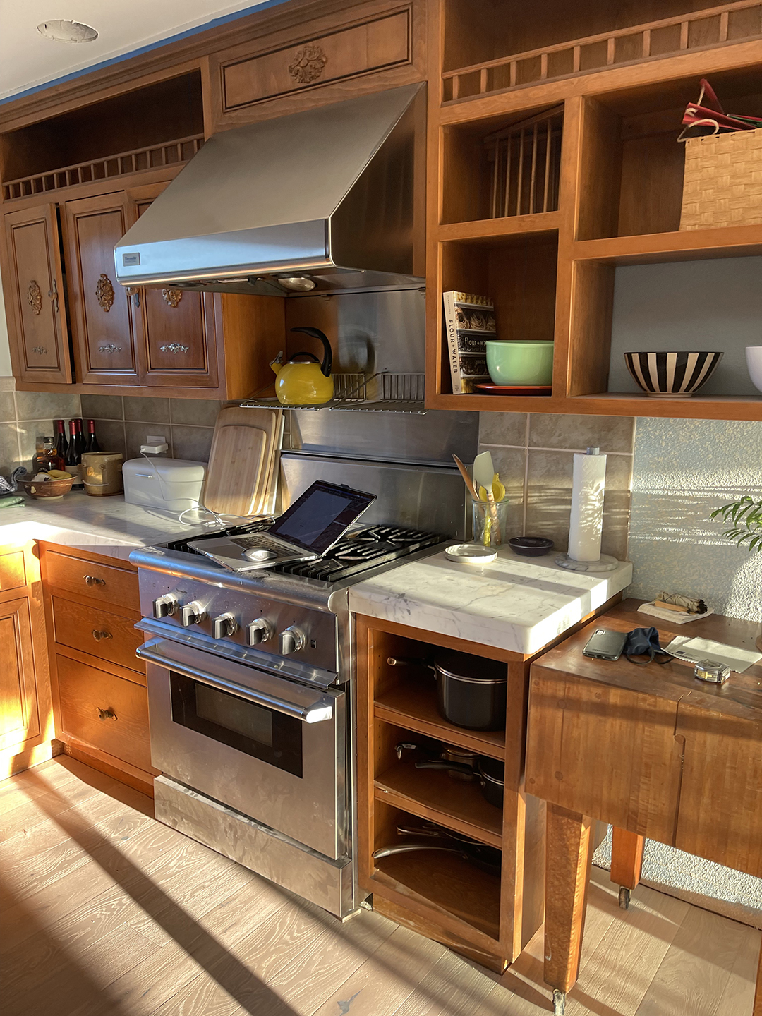 The zigzag drywall that surrounds the vent hood and upper cabinets wasn’t a random addition. To make the ceiling’s semi-vaulted drop-offs less distracting, Hommeboys wanted to incorporate something sculptural so you barely notice there’s another uneven surface in the room. An additional perk of the jagged walls? They create shadows, which lends more depth to the narrow space and helps bounce around natural light throughout the day. The designers also aren’t fans of having upper cabinets free-floating on a wall with nothing above them—this detail fills out the room and makes the kitchen feel complete.