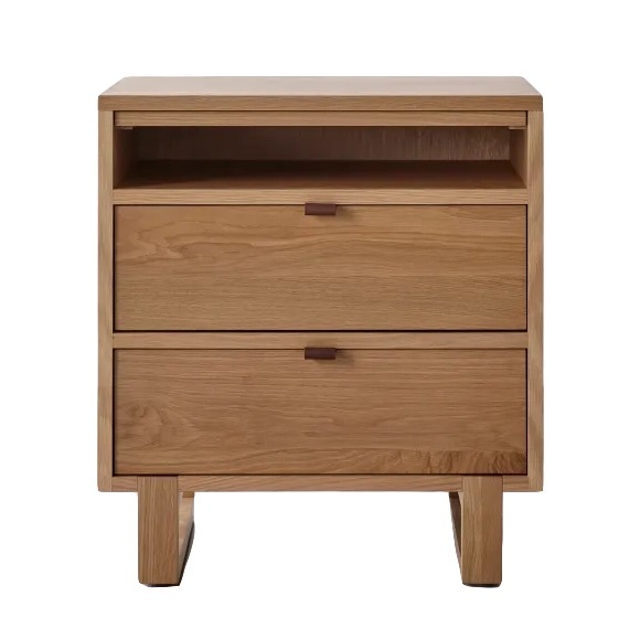 Sleek and minimalist, this white oak design wows with its hand-stitched full-grain leather drawer pulls—because luxe is in the details. The pullout surface is perfect for late-night reads or that all-important morning coffee.