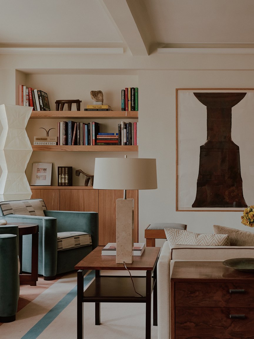 Designer Armando Aguirre went classic mid-century modern in the living room of this prewar apartment in Manhattan. The anchor pairing is a sofa designed by Charles Pfister in the 1970s for Knoll, which is cozied up to an Edward Wormley side table from the ’50s.