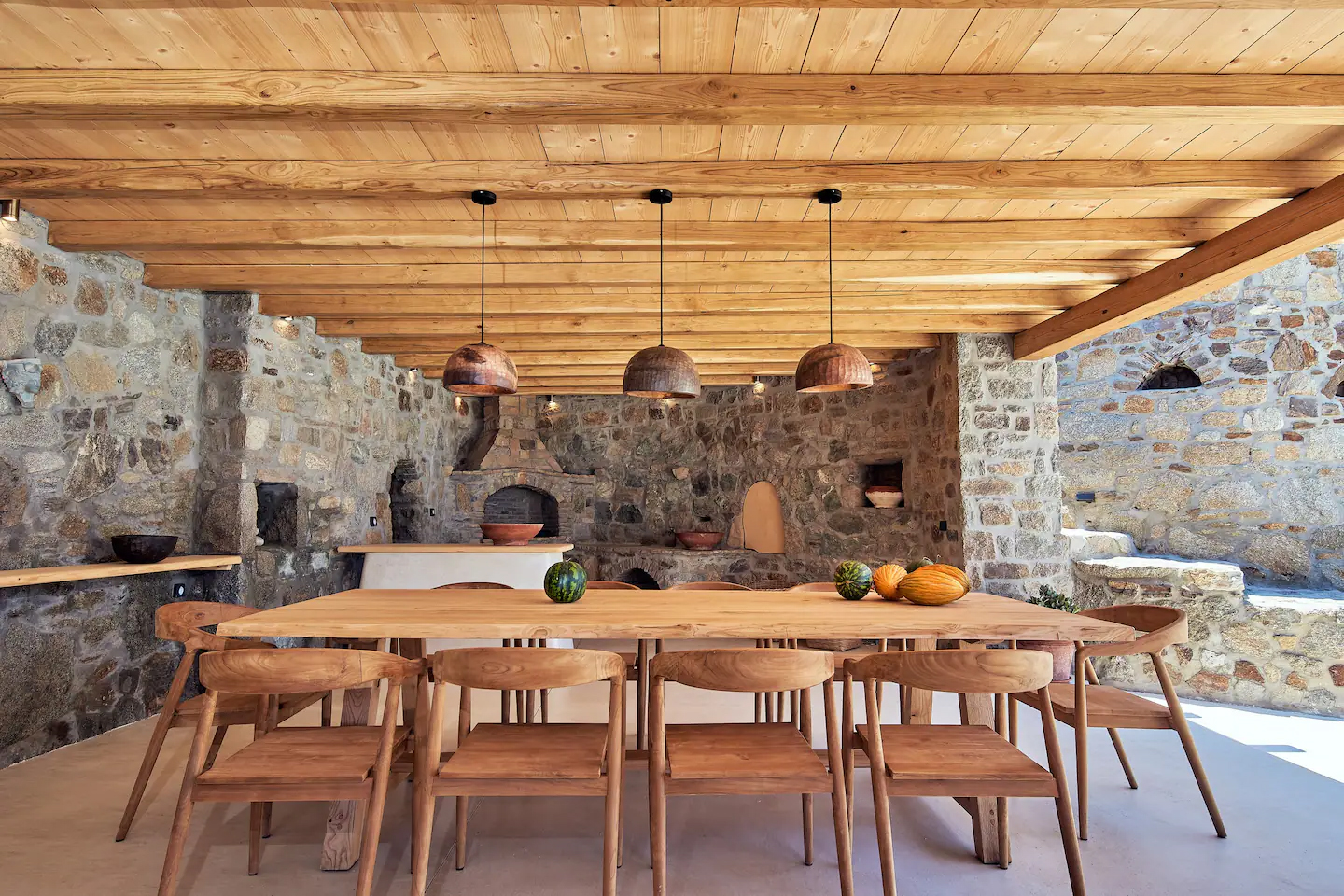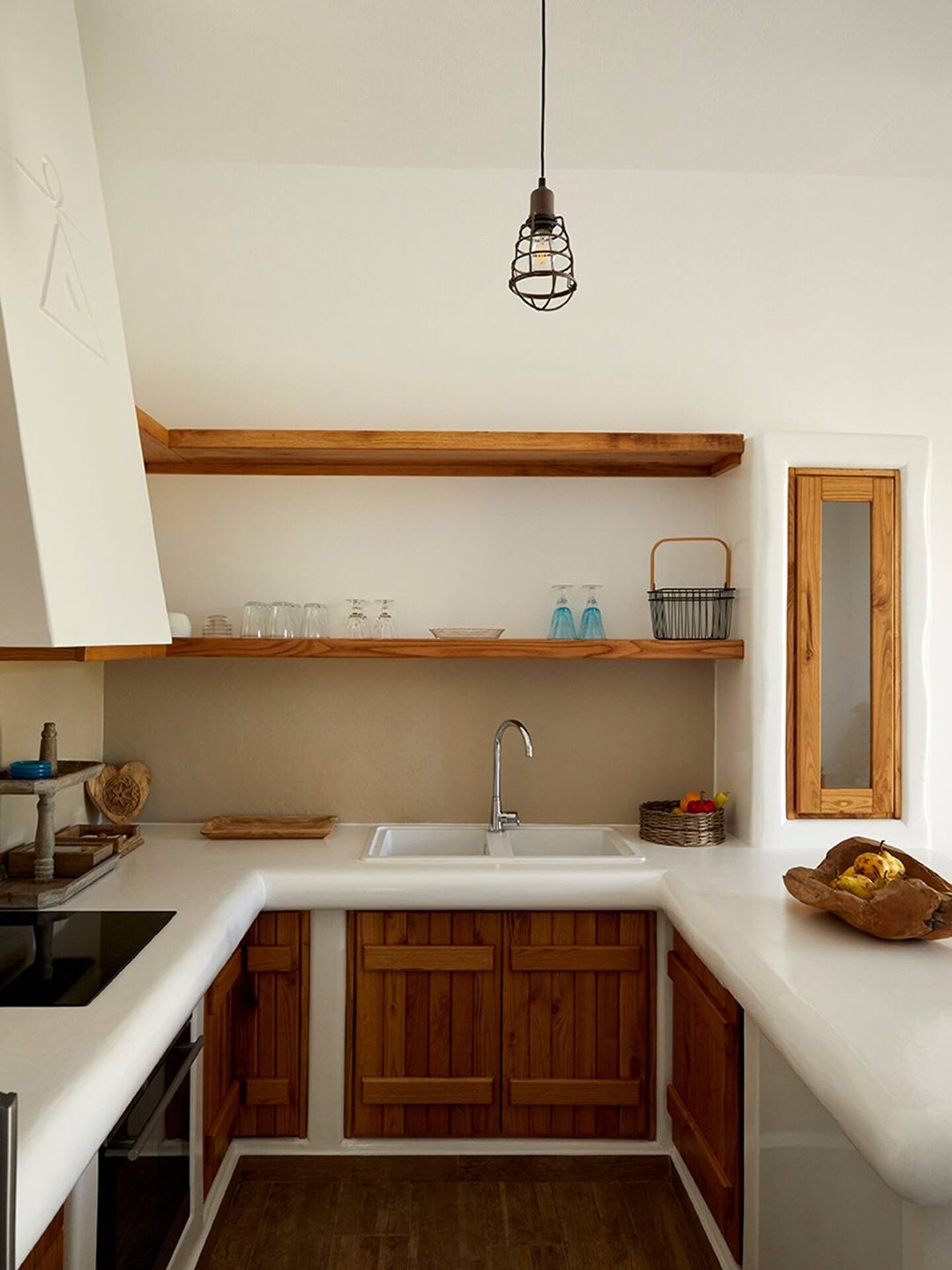 Cooking isn’t on most people’s to-do list while they’re on vacation, but there’s something so soothing about the chunky countertops in this Cycladic home that you might feel tempted to stay in at night. The cool curves also find their way into the spacious bathroom and outdoor dining area.