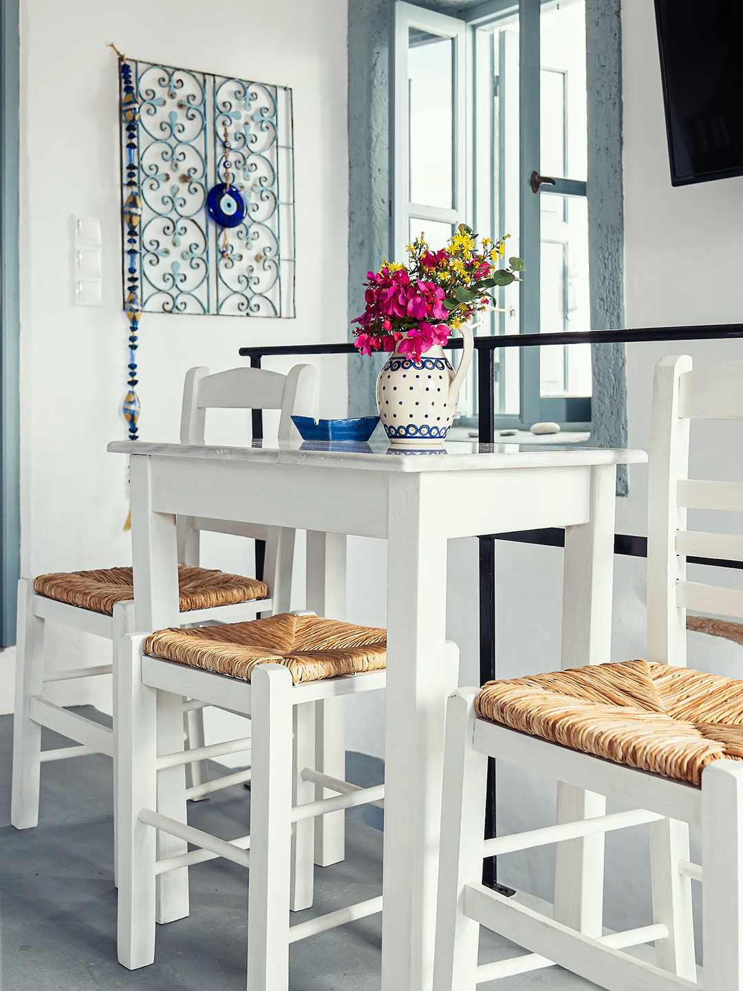 Did you even go to Greece if you didn’t stay within the cavernous, whitewashed walls of a yposkafo? While this style is ubiquitous across the island, we love the spirally stone stairwell, curved banquette, and traditional architecture of the Castle Suite.