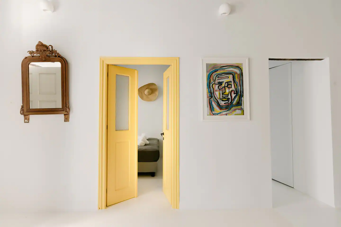 There is no shortage of sunshine in this sweet one-bedroom. As if mimicking the rays sparkling on the sea outside, the happy hue can be found on the doorways, cabinet handles, mirror frames, and even the refrigerator inside.