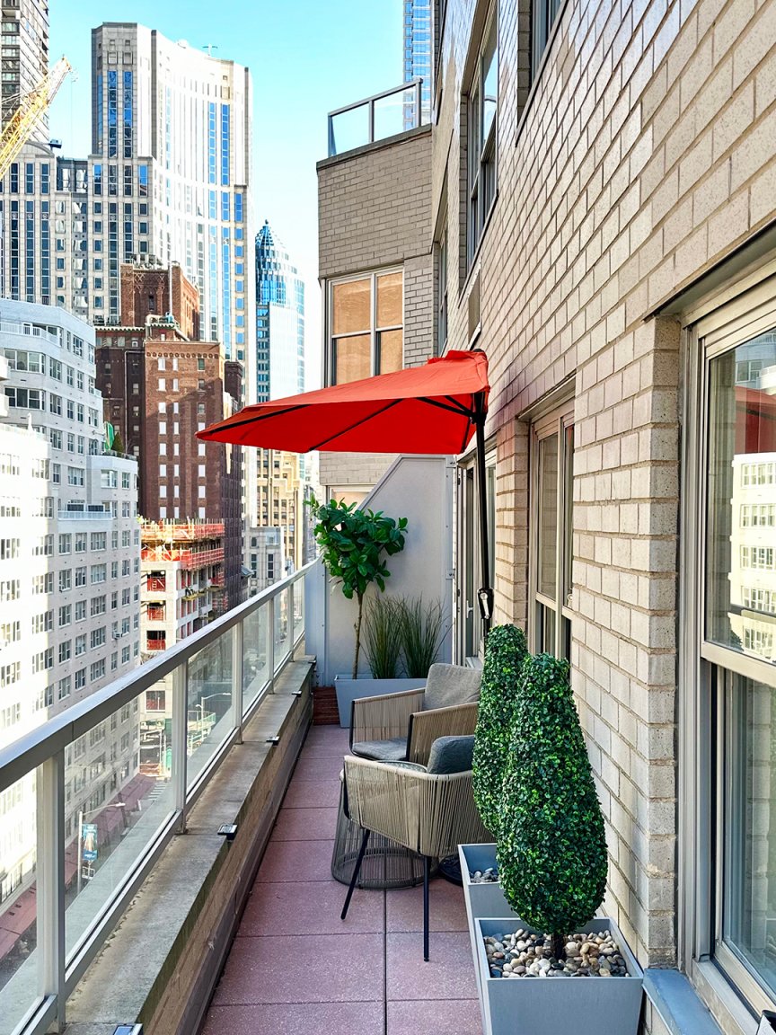 Now the pair can dine alfresco even when it’s drizzling, and when the sun hits the terrace during the day, they can lounge in the shade. With the twist of a knob, Dziadul can easily put the umbrella up or down (though he says on his particular one, the directions are backward), and it’s sturdy enough to withstand New York’s windy winter and prespring showers.