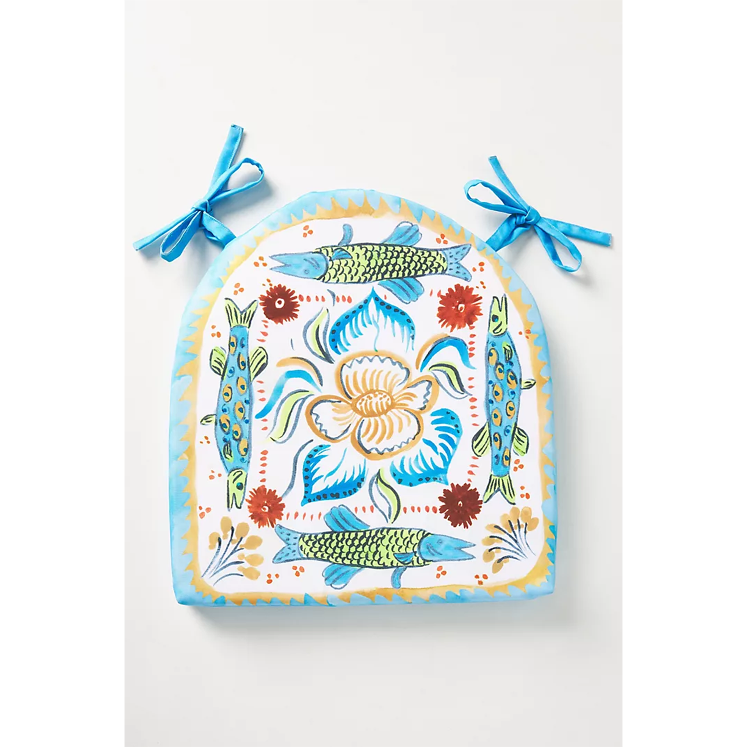 Stylish stemware is easy to find at Anthropologie, but getting it on sale is another story. Luckily the Ramona set in a sky blue and light green combo is part of the promo. However, if your cupboards are already bursting with glassware, there are plenty of other tabletop additions to consider, from a confetti-covered pitcher to a fringed quartet of cotton napkins. We also recommend checking out the aquatic-print cushions that tie onto the backs of dining chairs; they’ll put you square in the middle of the fish decor trend.