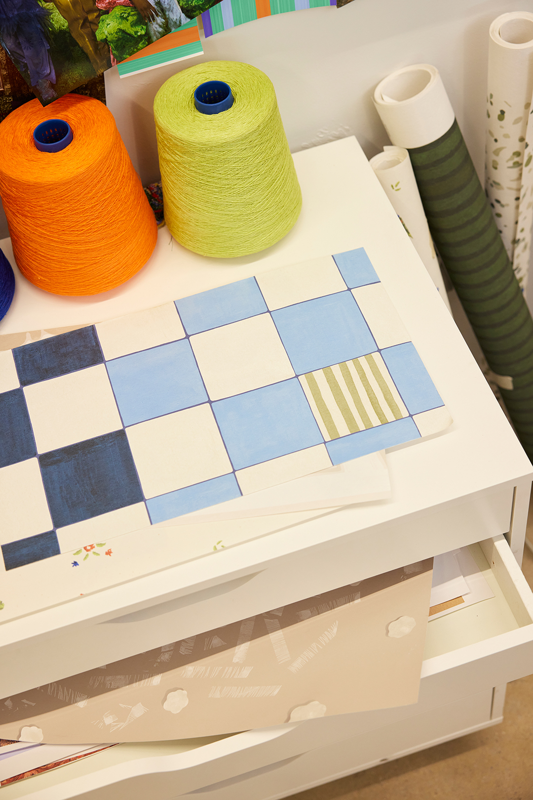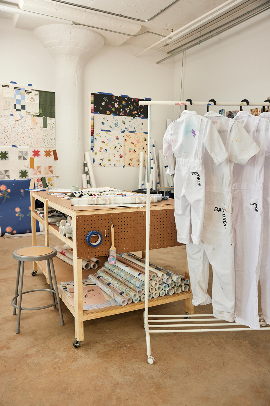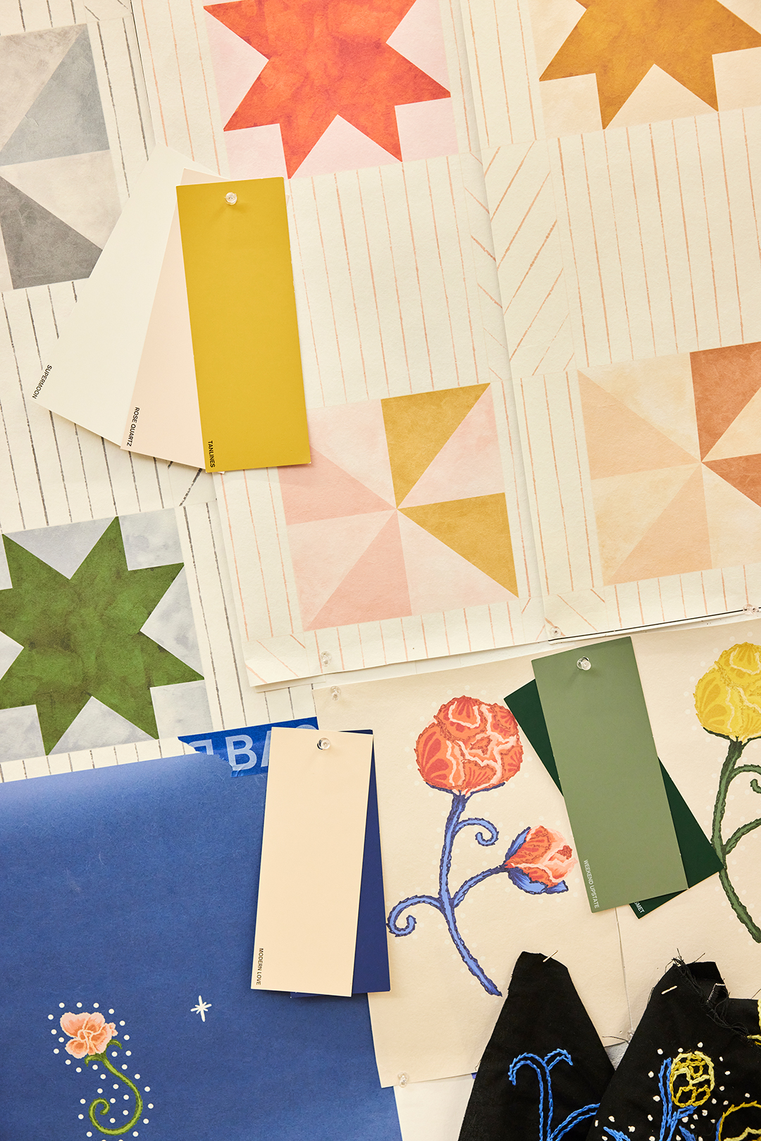 Natalie: We used Backdrop’s Cool Moon. We also have a full color wall of samples and layers of paint everywhere. Something that’s really important to us when designing wallpaper is living with it for a while. We always try to print out the wallpaper at scale, so we can see it in repeat and imagine how it would work in a variety of interior spaces.