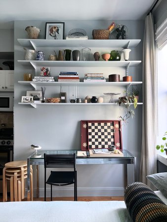 The outdoor shower in Justina Blakeney’s backyard is the highlight of her L.A. home. “I literally shower out here every single day,” she says. She built it on a budget by using leftover tile from an old kitchen project and transforming brick molds into wall-mounted shampoo shelves. When in doubt, it pays off to shop your own home.