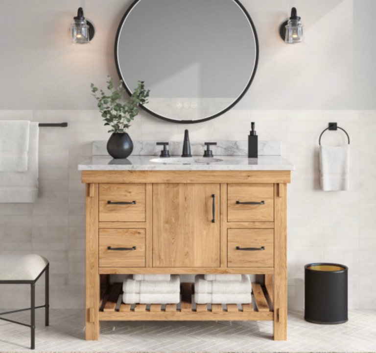 When it comes to other features, soft-close drawers and doors are must-haves (81 and 75 percent of people said they want them, respectively), with built-in electrical outlets (33 percent) and bespoke drawer organizers (26 percent) following. As for door styles? The timeless Shaker design remains a crowd favorite. Whether you’re inspired to embrace these trends or add your unique touch, here are some wood-finished bathroom vanities to kick-start your bathroom project.