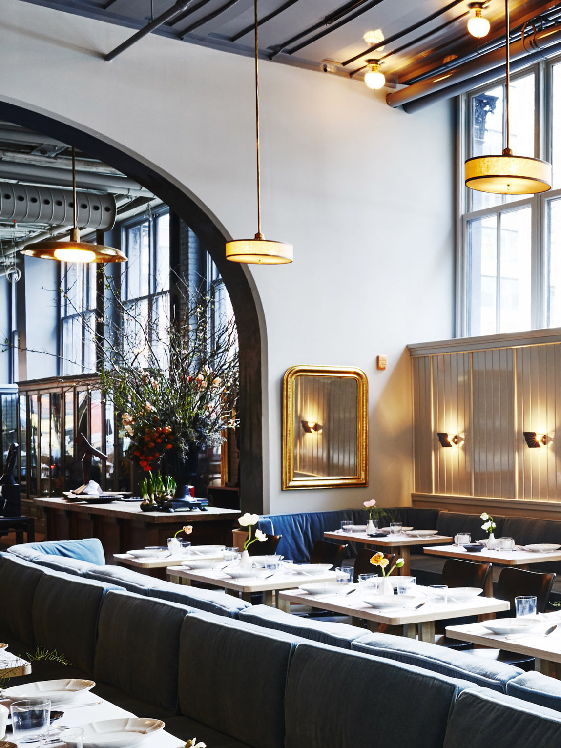 I’ve always been drawn to cooler tones, which is probably why Roman and Williams’s design of New York restaurant La Mercerie was, for me, love at first sight. The walls are drenched in the perfect shade of blue-gray, complemented by velvet banquettes in a deeper shade. It’s not overly saturated and can also look a bit green in certain light. I used this as a touch point, comparing images of the space to my swatches.