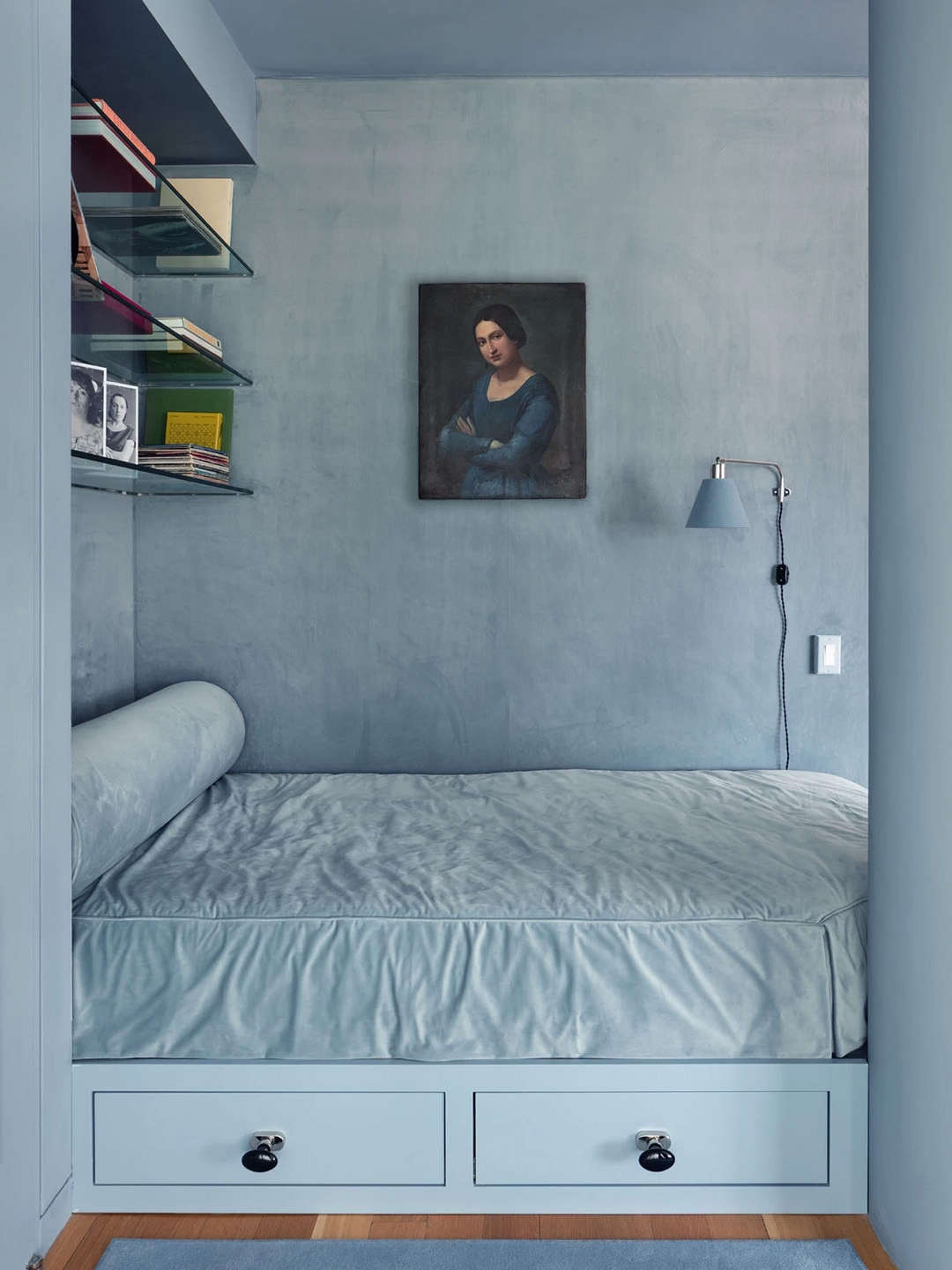 More really is more with this color; layering it with shades in the same family creates a calming effect—like putting on blue-tinted glasses. I have had images of this room, designed by New York design firm Charlap Hyman & Herrero, pinned for years; I loved the bed so much it was one of the reasons I went all in and used blue bedding, too.