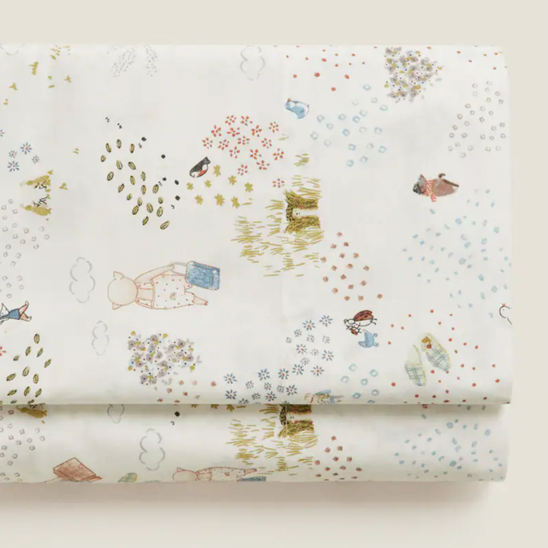 While we understand the logic of buying bedding that can last your children well into tween and teen years, sometimes you want to hold onto that little kid magic a bit longer. When that’s the case, we suggest you head straight for Zara Home, whose kids’ bedding features adorable designs like The Three Little Pigs and Peanuts. The brand also wins bonus points for interpreting these classic children’s characters into designs that are neither gaudy nor too bright, blending with a large assortment of chic checks, stripes, florals, and waffle knits. We’re currently crushing on the flannel duvet with shams held together by cotton bows. In fact, you can also stick to the more neutral bedspread and up the playful factor with a plush cuddle companion—the gingham-footed fox gets our vote—or decorative throw pillow. There’s everything from classic patchwork covers to moon– and turtle-shaped cushions.