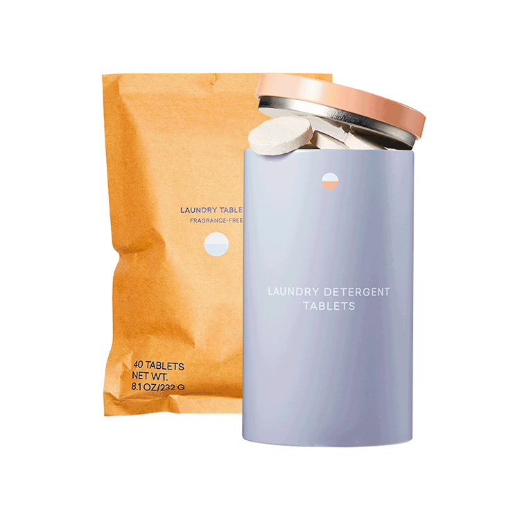 The Blueland Laundry Starter Set comes with a compostable pouch filled with 60 tablets—plus a trendy (and dishwasher-friendly) cylindrical storage container to keep them in. The tablets—which are vegan and gluten-, soy-, and nut-free—are solid, chalky, and unwrapped (which eliminates any concerns about leftover soluble packaging clinging to the inside of your machine). We noticed chips on a few of ours, and the tablets didn’t dissolve on immediate contact with the water, but each of the loads finished free of residue or stains. The instructions recommend adding an extra tablet for smellier or heavy-duty loads; our gym clothes and everyday outfits subjected to summer heat definitely needed more than one. The steel can fits on a small pantry or laundry room shelf, and you can order refills (40 tablets for $14 or 120 tablets for $32) whenever you need to replenish. To note: Blueland also makes our favorite dishwasher detergent.