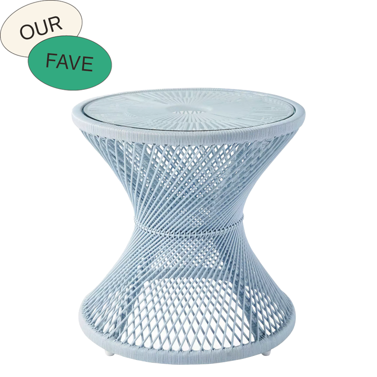 Weather-resistant wicker is a traditional outdoor staple—one that Domino-favorite Serena & Lily does particularly well. Our top pick for this category features a lovely powder blue hue along with a supportive glass top and unique hourglass shape. Wicker tables are a lightweight, soft style that still offer a bit of textural intrigue and, as seen below, a pop of color.