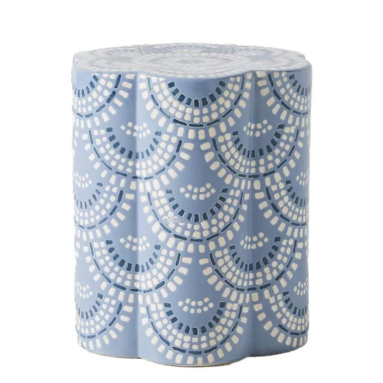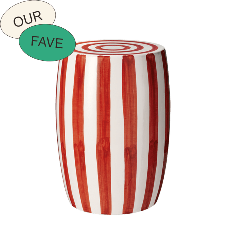 Ceramic side tables are made for pattern play, offering design enthusiasts the opportunity to layer some extra dimension into their outdoor setup. Our uncontested top pick for this category is OKA’s glossy cabana-striped stool, which also comes in a nautical navy and candy apple red. Minimalists might prefer UO’s textural shapely style or Meg Morrison’s one-of-a-kind work of art.