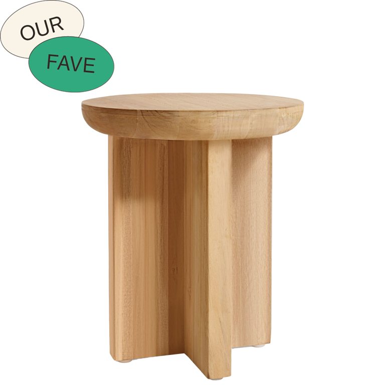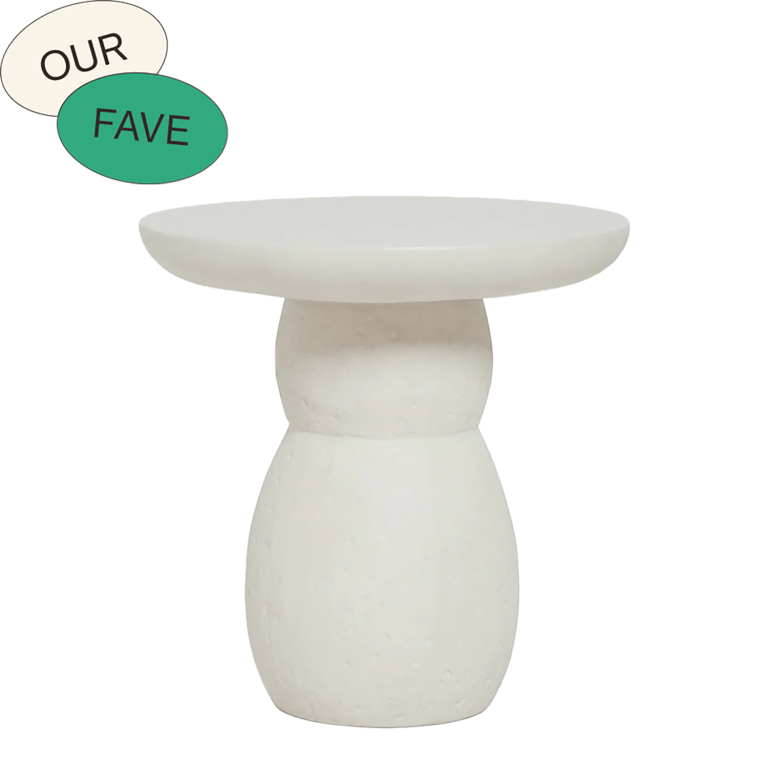 Side tables crafted from concrete and fiberstone offer a sturdier surface that isn’t at risk of toppling over or rusting in the rain. However, the material is more porous than metal, so it may show the occasional stain. Our favorite is, unsurprisingly, crafted by Sarah Sherman Samuel for Lulu and Georgia. We adore a pedestal silhouette, especially one with softly rounded edges and a curved base. Runners-up include a squiggly green number from West Elm, a sharp matte-black Amazon score, and even a tiered duo.