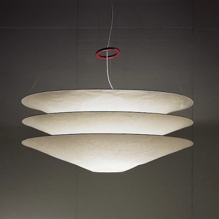 A 1980s touchstone of lighting design, Ingo Maurer’s Floatation Suspension consists of three handmade Japanese paper shades and a red iron ring that acts as a counterweight for height adjustment. This heirloom-worthy fixture is a dining room or living room statement piece.